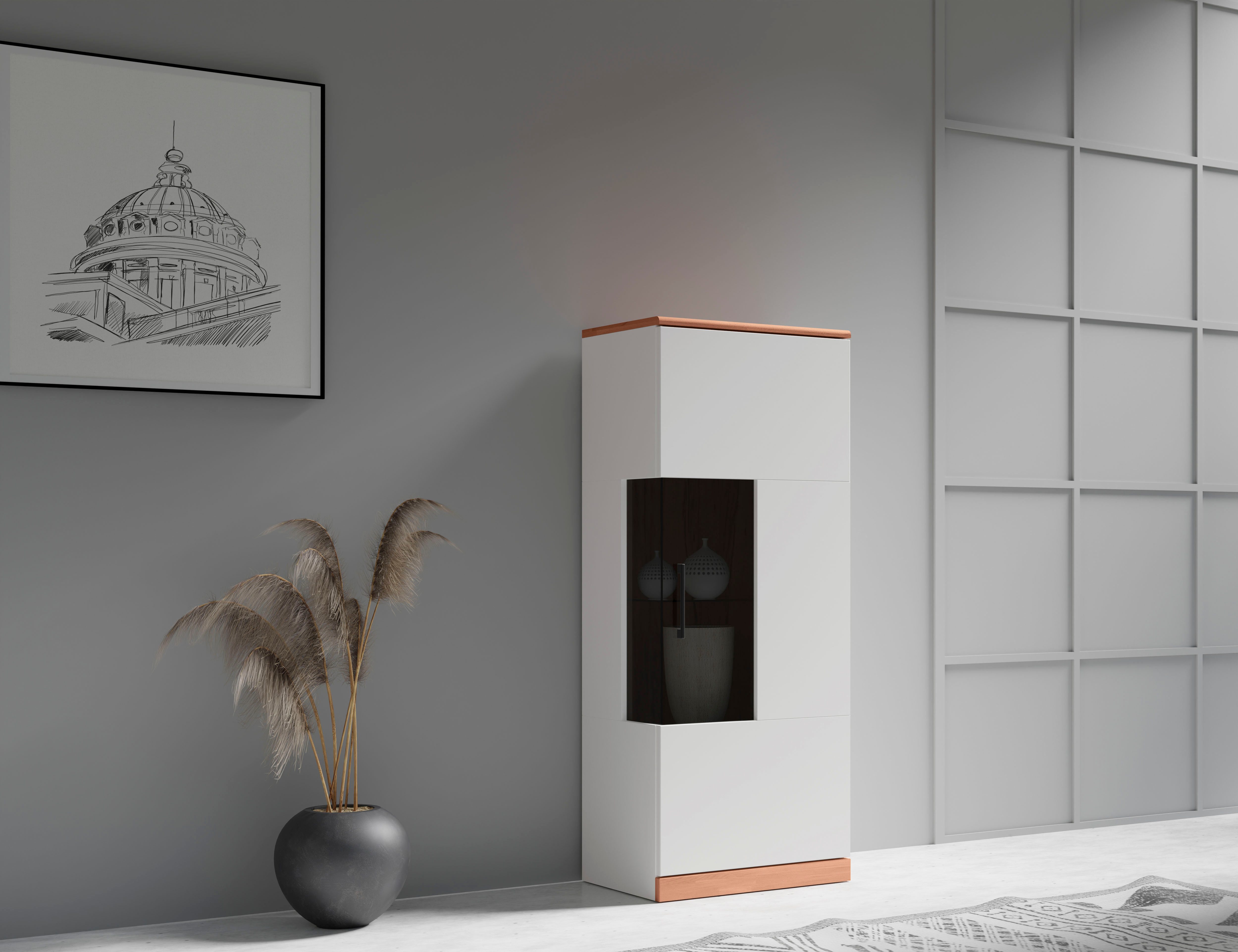 Wissenswertes | Ausgeführt in zwei Farben: Weiß und Massivholz. Die Türen sind mit dunklem Glaseinsatz aus gehärtetem Glas ausgestattet was gleichzeitig für elegante Optik aber auch für Stabilität und Sicherheit sorgt Die schwarzen Griffe aus Metall verleihen eine hochwertige und moderne Note Einlegeböden teilweise variabel einsetzbar Oberplatte aus Massivholz |