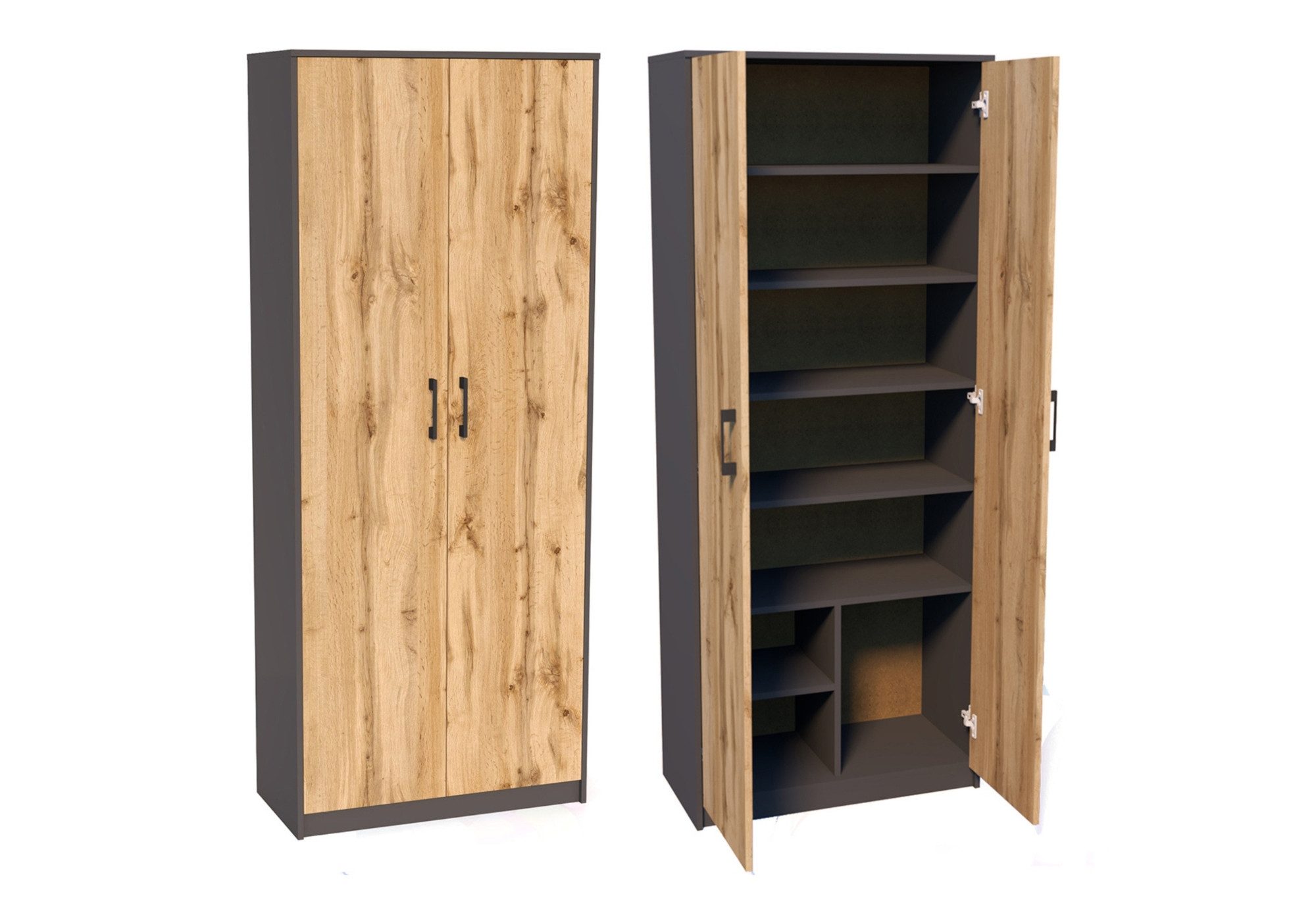 Diese stilvolle und funktionale Bücherregal bietet reichlich Stauraum und verleiht jedem Raum eine moderne Eleganz. Es verfügt über sechs geräumige Regale, die sich ideal zur Organisation von Büchern, Dekorationsgegenständen oder anderen Utensilien eignen. Das Bücherregal besteht aus einer langlebigen laminierten Platte mit einer Stärke von 16 mm, die für Stabilität und Langlebigkeit sorgt. Die vordere Kante der Tischplatte ist mit Soft-Edge-Technologie gefertigt, was eine glatte und sichere Oberfläche gewährleistet, die das Gesamtdesign ergänzt. Die hochwertigen Griffe aus Polymermaterial verleihen dem Regal einen Hauch von Raffinesse, während die matte Oberfläche dem Bücherregal ein elegantes, zeitgemäßes Aussehen verleiht. Mit zwei Türen für zusätzlichen Stauraum und einem klaren, modernen Look ist dieses Bücherregal sowohl praktisch als auch stilvoll.