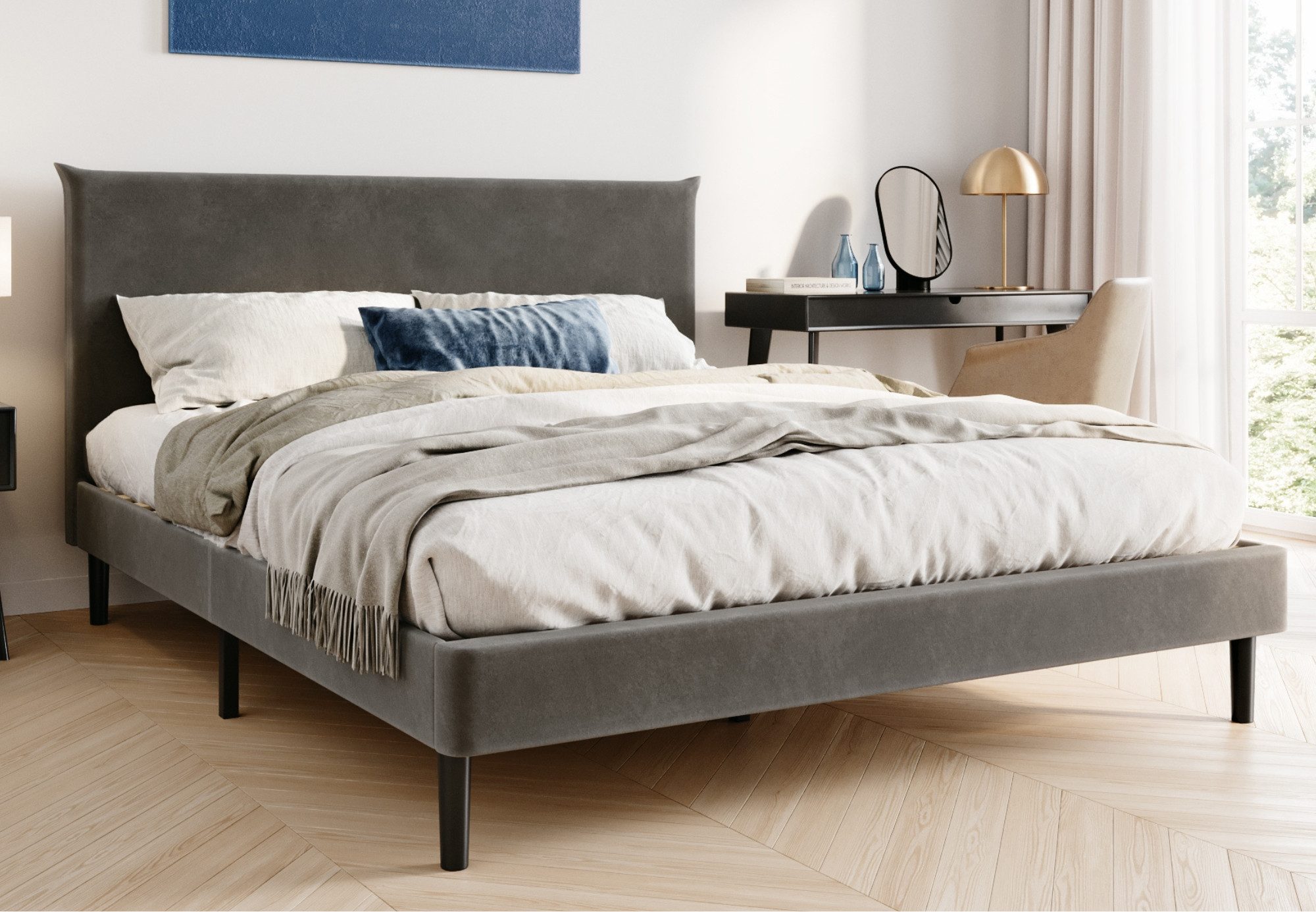 Durch das minimalistische Design fügt sich das Polsterbett harmonisch in verschiedene Schlafzimmerstile ein – von modern bis klassisch. Die Selbstmontage ist unkompliziert, da alle notwendigen Teile sowie eine detaillierte Montageanleitung im Lieferumfang enthalten sind.