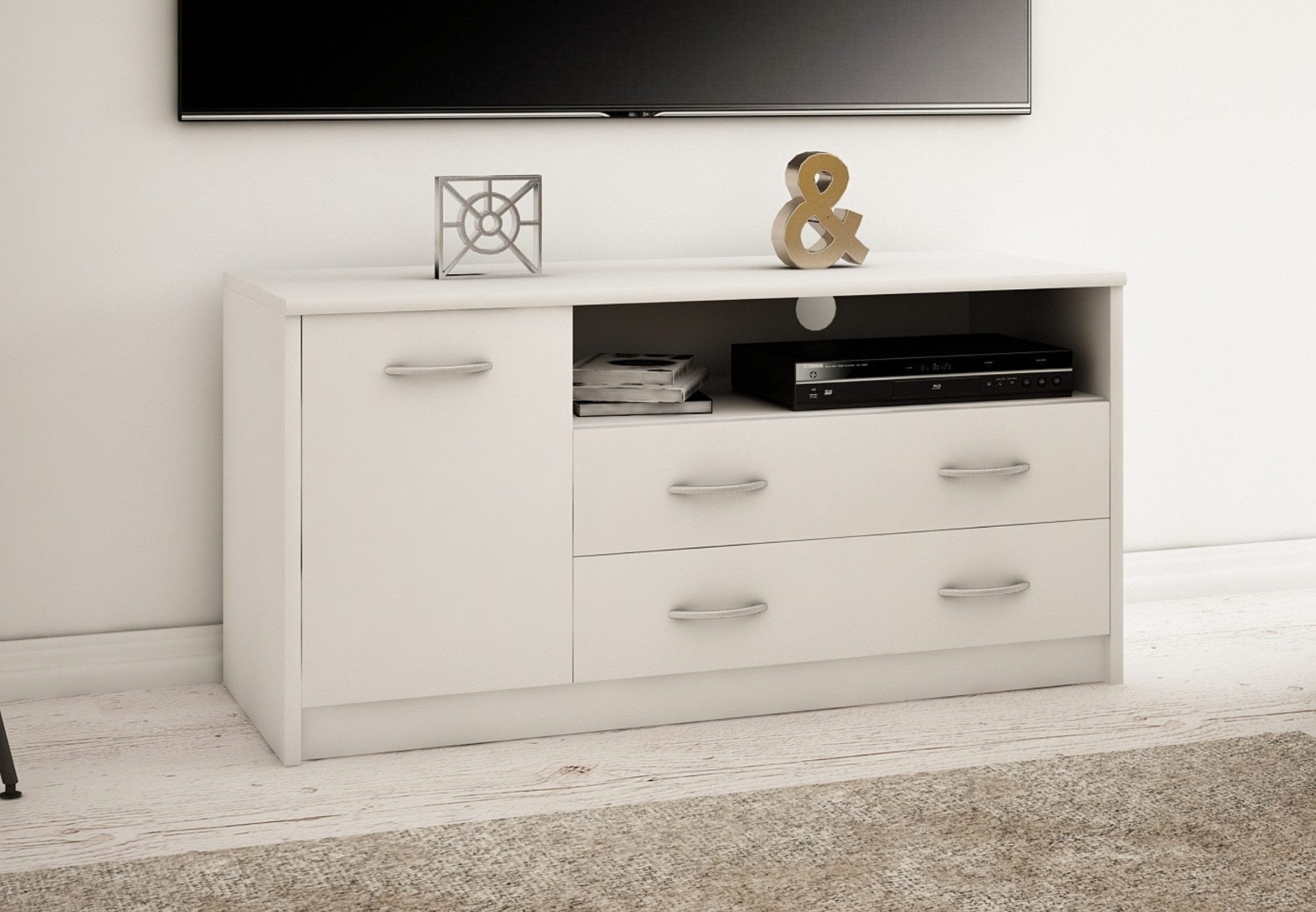 Der TV-Schrank wurde entworfen, um Funktionalität mit Stil zu vereinen, bietet großzügigen Stauraum und verleiht Ihrem Wohnbereich einen modernen Touch. Der Schrank verfügt über eine Tür, zwei Schubladen und zwei Regale, die es Ihnen ermöglichen, Ihre Medienzubehörteile organisiert und leicht zugänglich zu halten. Gefertigt aus einer langlebigen 16mm laminierten Platte, gewährleistet der Schrank eine lange Lebensdauer, verstärkt durch einen 0,5mm dicken Rand, der zusätzlichen Schutz bietet.