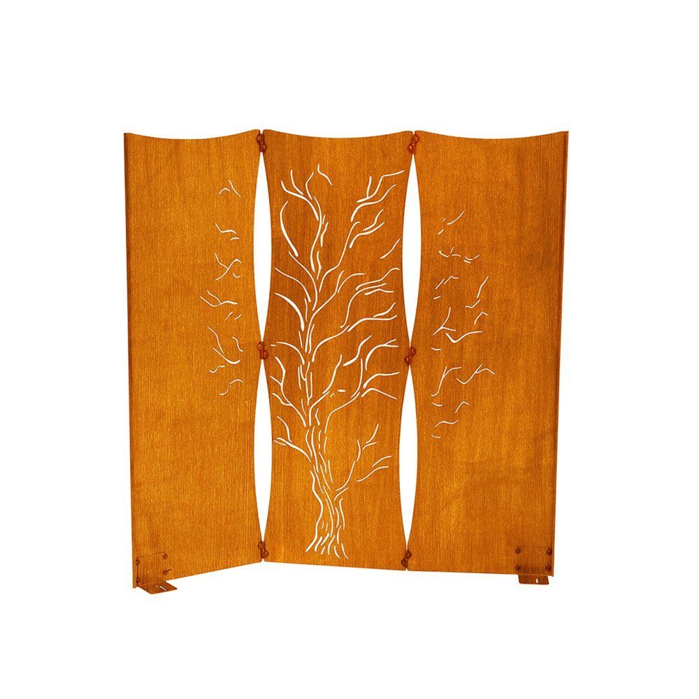 Der Sichtschutzzaun TREEFLOW ist in verschiedenen Bereichen einsetzbar. Das Stahlgemälde dient als Sitzschutz, als Dekorationselement und liegt mit seiner Rostoptik im Trend der angesagtesten Gartenlandschaften.