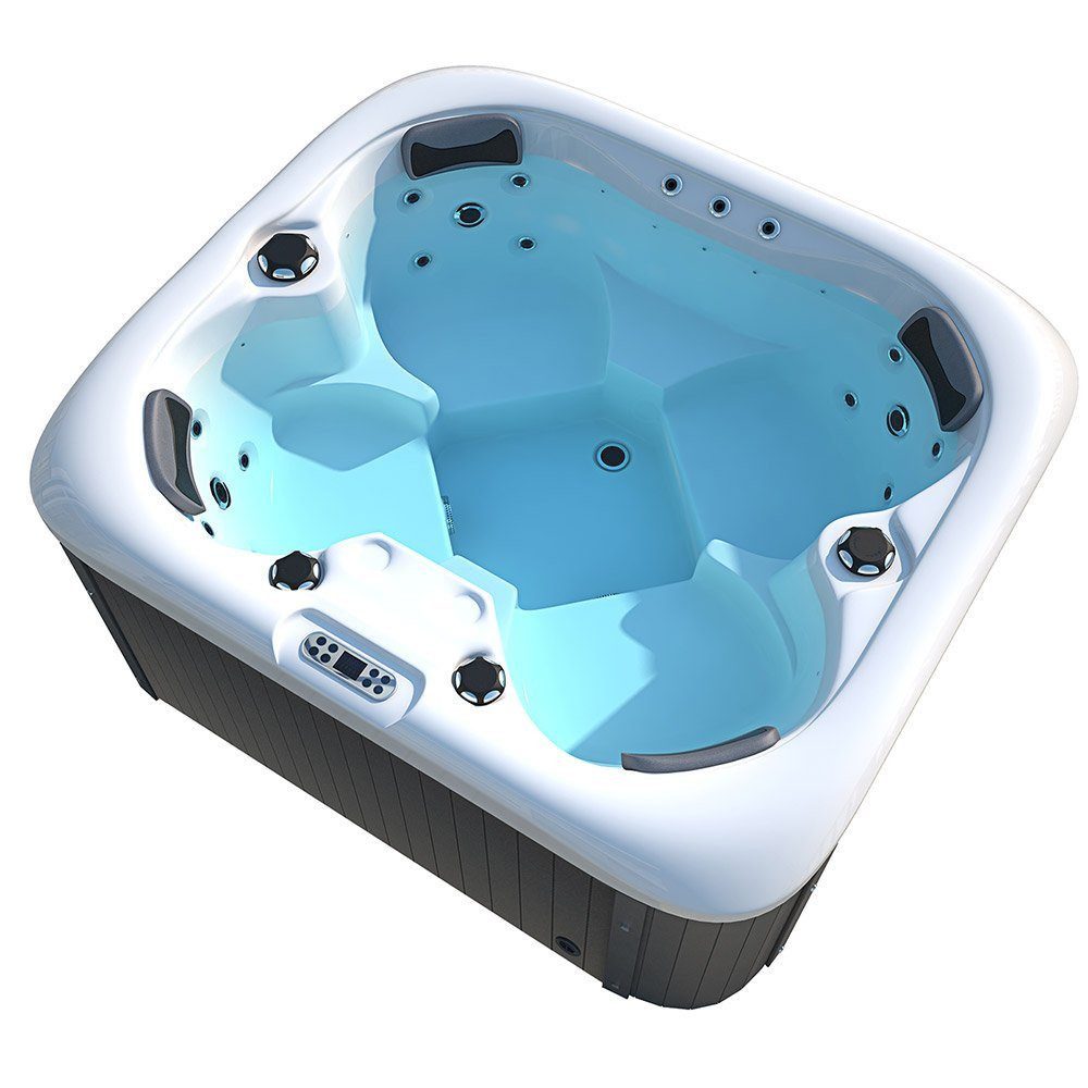 Unser einzigartiger Whirlpool für den Außenbereich macht aus Garten und Sonnenterrasse einen stilvollen Wellnessbereich mit absolutem Urlaubsflair. Gönnen Sie sich den Luxus von sagenhaften 19 Düsen, die Körper und Seele beleben und für das optimale Massageerlebnis sorgen. Jede Düse lässt sich durch leichtes Drehen individuell in der Intensität und Richtung einstellen. Die starke Whirlpoolpumpe ist zweistufig einstellbar. Sie haben die Wahl, die starken Massagedüsen zu genießen. Oder entspannend im Wasser zu liegen, während die Umwälzfunktion ihr Wasser leise und effektiv reinigt. Zusätzlich erhalten Sie von uns ein passendes Filterset. 15 LEDs knapp unter der Wasseroberfläche sorgen, mit der in der Mitte positionierten, großen Unterwasser-LED, für ein bezauberndes Lichtspiel. Vier schwarze Kopfstützen sorgen für eine bequeme Liegeposition. Durch das eingebaute Display am Rande des Whirlpools lassen sich verschiedene Funktionen regeln. Sie können hier nicht nur die Temperatur, sondern auch die Massagedüsen und das Licht bedienen. Jeder Sitzplatz lässt sich mithilfe der 4 manuellen Reglern ansteuern. Ein optischer Hingucker wird der Whirlpool vor allem durch die dunkelgraue Außenverkleidung aus strapazierfähigem WPC (naturfaserverstärkter Kunststoff). Vorteile dieses Materials: Es ist langlebig, temperatur- und formbeständig, wasserfest, schwer entflammbar, hygienisch und leicht zu reinigen. Außerdem kommt es nicht zu ausgeblichenen Stellen, was bei Gartenartikeln generell als Problem gilt. Unterschiedliche Strukturen der Verkleidung sorgen für das gewisse Extra. Durch die kompakte Размер von 180 x 160 x 79 cm passt der Pool in fast jeden Garten und bietet Platz für bis zu 4 Personen. Auch auf Terrassen oder in Wintergärten kann der optisch, wie technisch hochwertige Whirlpool platziert werden.