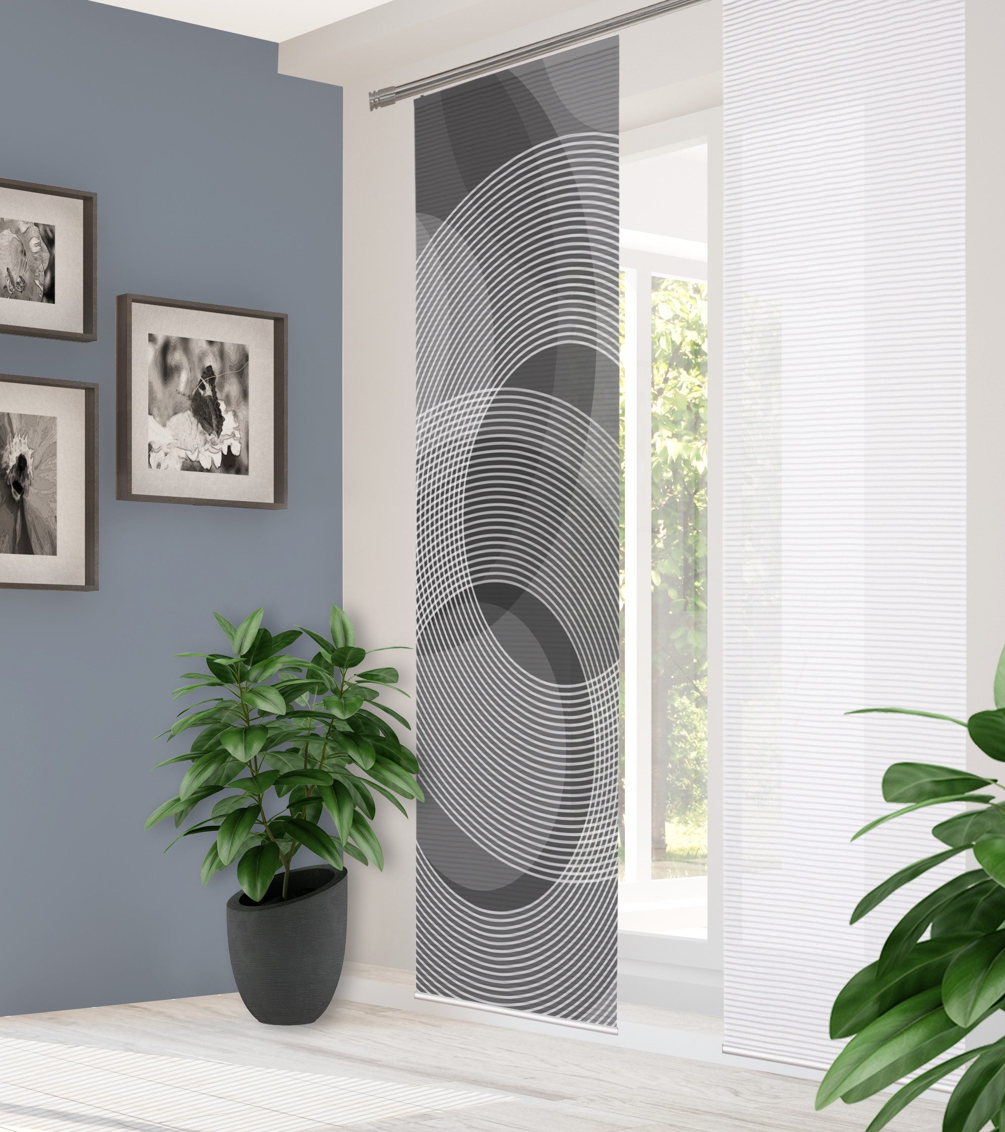 Mit seinem abstrakten Kreismotiv ist der Schiebevorhang AFONSO ein faszinierendes und modernes Dekorationsstück