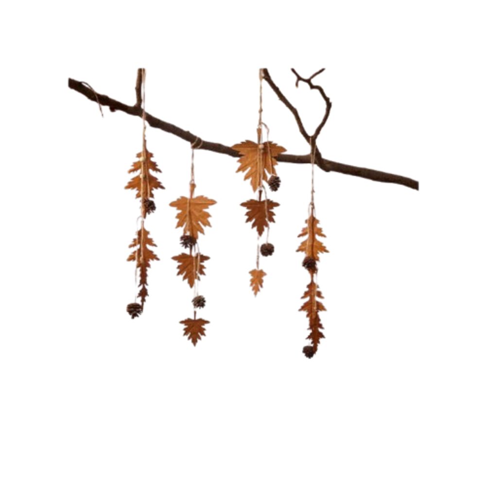 Die charmanten Metallblätter werden von dekorativen Naturzapfen und Holzperlen ergänzt, die an einer rustikalen Schnur befestigt sind. Diese Kombination aus Metall, Naturmaterialien und der erdigen Farbgebung macht die Hänger zu einem vielseitigen Dekorationselement für die Herbstzeit und darüber hinaus.
