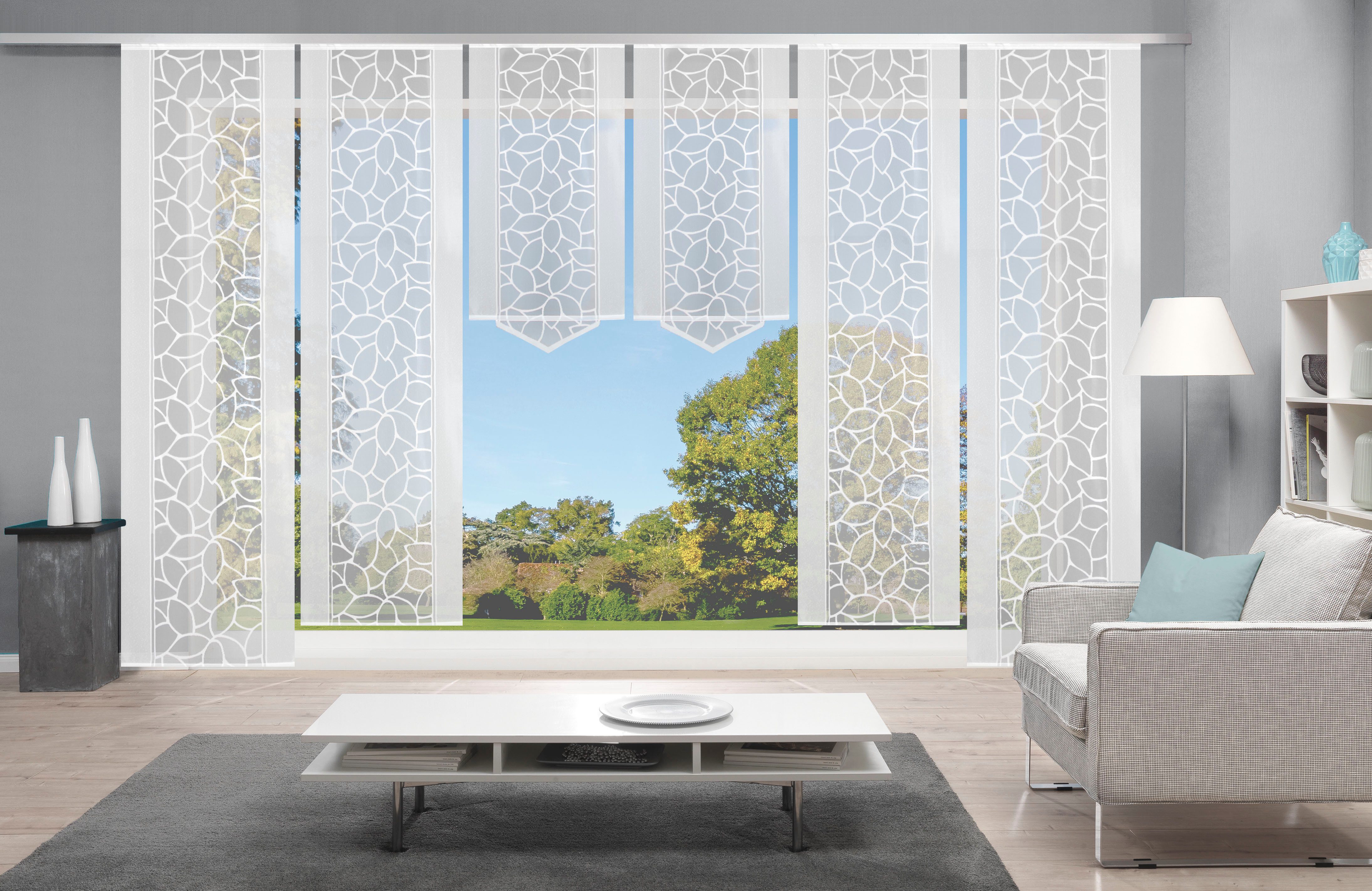 Der Schiebevorhang »JENNA« von HOME WOHNIDEEN ist eine besonders ansprechende Fensterdekoration. Das zarte Blätterdesign auf dem transparenten Jacquardgrund fügt sich optisch ausgezeichnet in verschiedene Wohnstile ein. Das Set besteht aus 4x Schiebevorhängen mit geradem Abschluss (2x Höhe 245cm und 2x Höhe 225cm) und 2x Schiebevorhängen mit Dreiecksabschluss (Höhe 125cm). Aufhängung erfolgt mittels Flauschband und Klettschiene an Ihrer Gardinenschiene. »JENNA« lässt sich dank des mitgelieferten Zubehörs spielend einfach an gängigen Gardinenschienen anbringen, so zaubern Sie mühelos eine behagliche Wohlfühlatmosphäre in Ihren vier Wänden. Zur Beschwerung und Stabilisierung dient die beiliegende Beschwerungsstange. 100% Polyester
