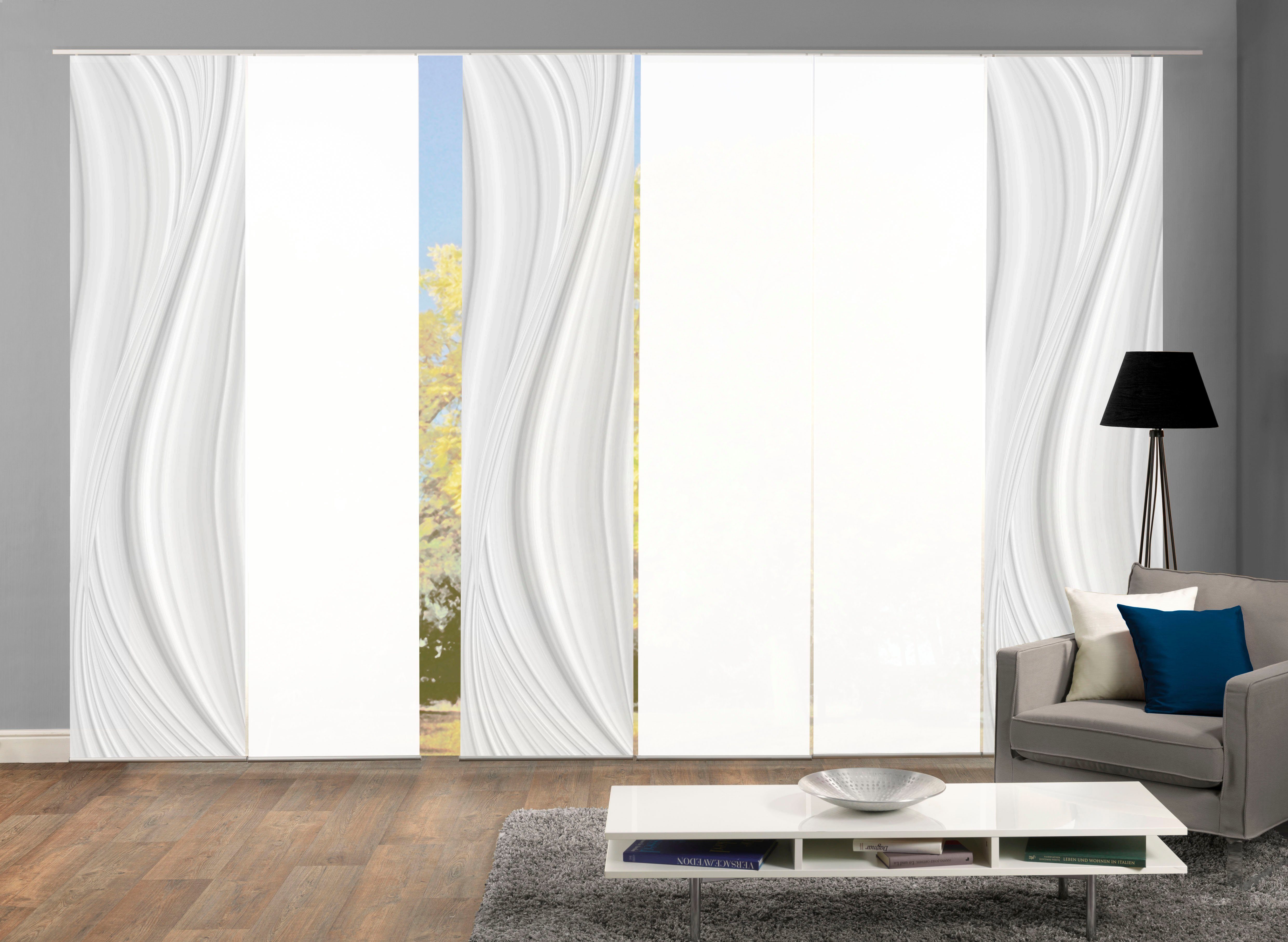 Hinweis Dekoration | Die angegebenen Maße sind die fertig dekorierten Maße. Eine Schiebegardine ist eine schmale, glatt hängende Stoffbahn, die sich sowohl als Sichtschutz als auch zur Raumteilung eignet. Durch die Schiebetechnik sind Schiebegardinen sehr flexibel einsetzbar. |