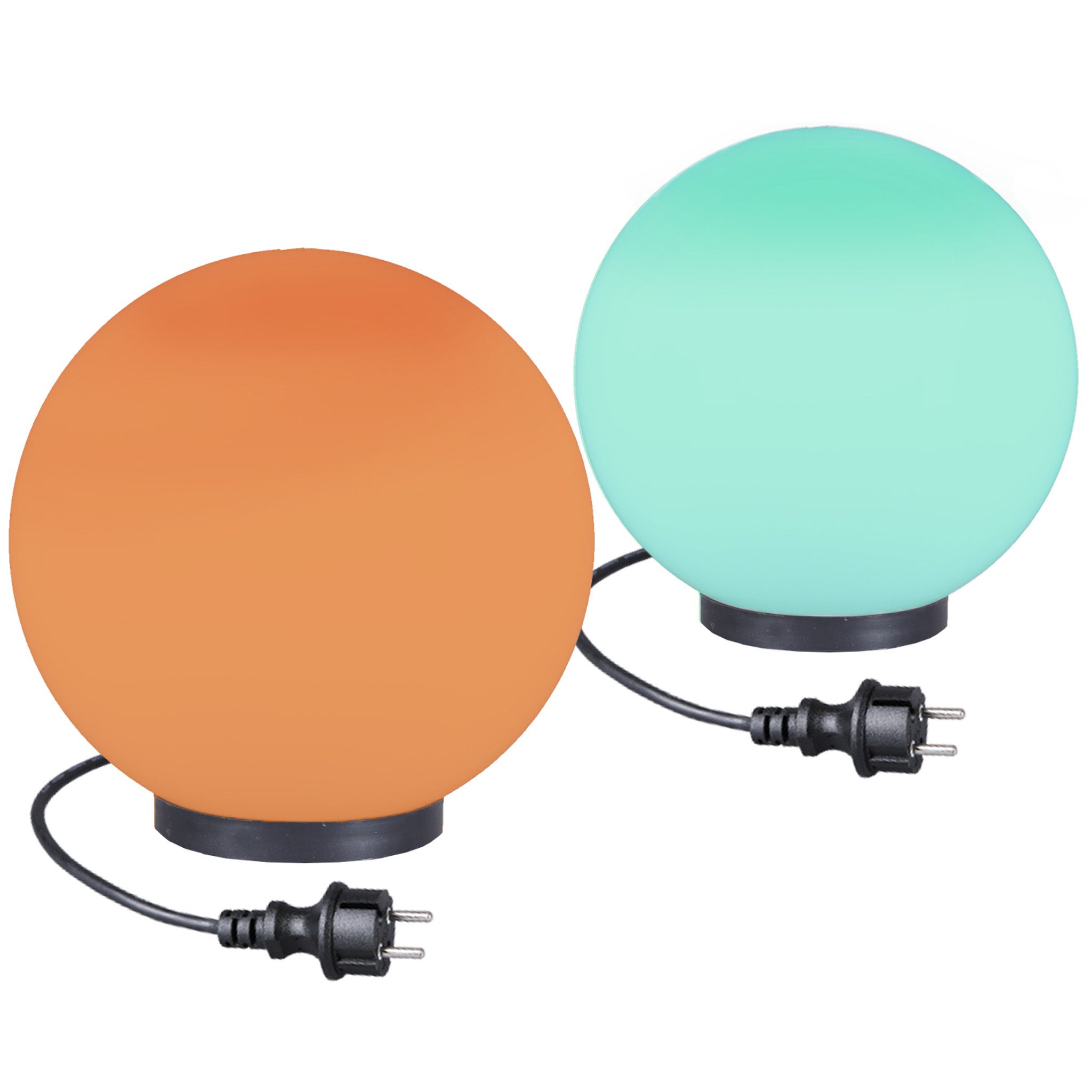 1x 20cm / 1x 25cm Ø Kugelleuchte, 2x Bodenplatte inkl. Kabel, 2x RGB Leuchtmittel mit Fernbedienung, Gummifüße