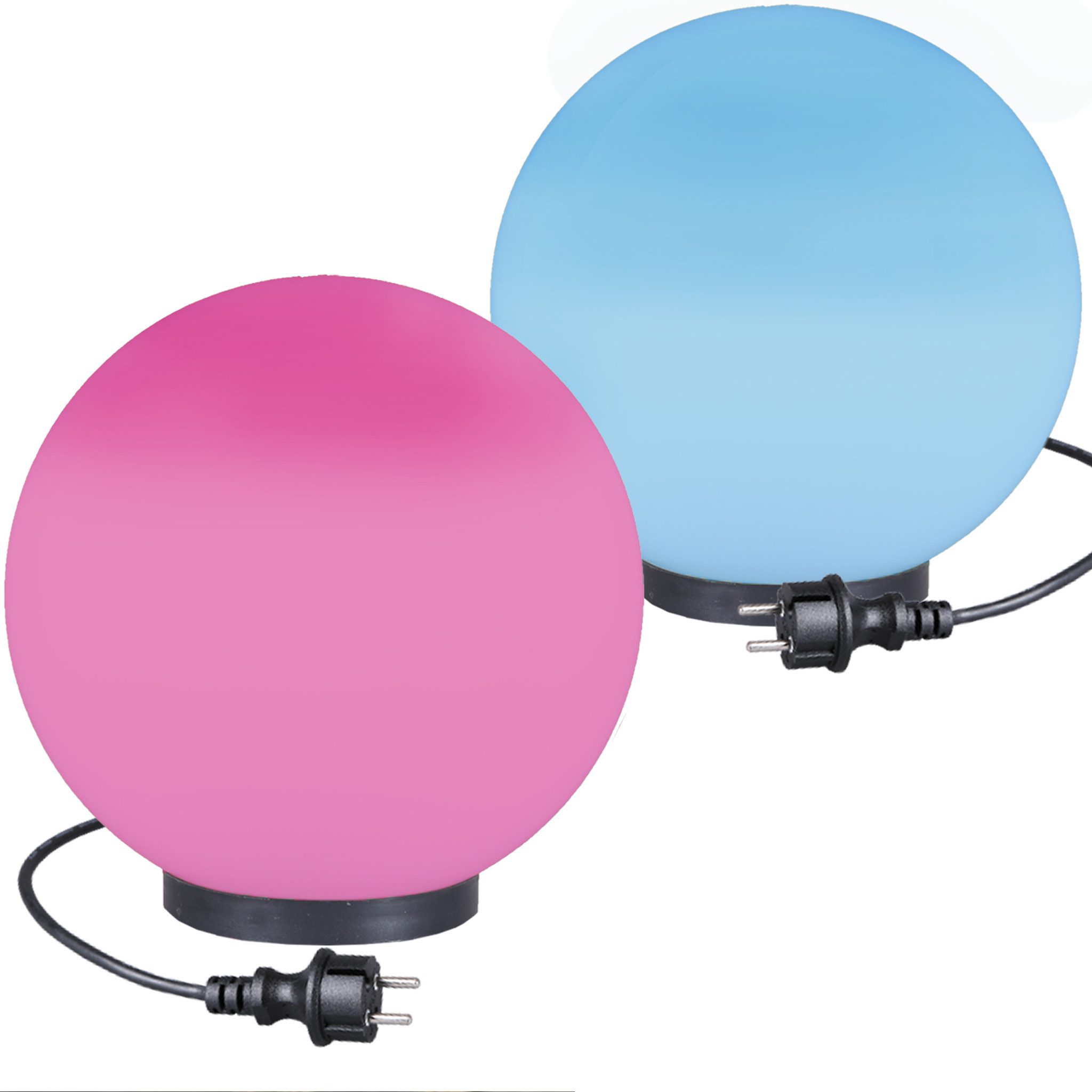 2x 40cm Ø Kugelleuchte, 2x Bodenplatte inkl. Kabel, 2x RGB Leuchtmittel mit Fernbedienung, Gummifüße