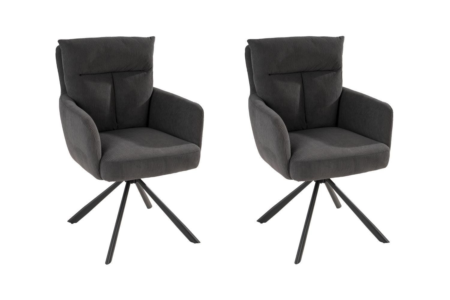 Die Polsterstühle von Home4You im 2er Set vereinen Komfort und modernes Design. Der dunkelgraue Cordbezug harmoniert perfekt mit dem schwarzen Metallgestell. Dank gepolsterter Armlehnen und einer Federkernpolsterung im Sitz bieten sie hohen Sitzkomfort. Die 180-Grad-Drehfunktion mit Rückholmechanismus sorgt für Flexibilität. Mit einer Sitzhöhe von 49 cm und einer Sitztiefe von 47 cm sind sie ideal für Esszimmer oder Büro.