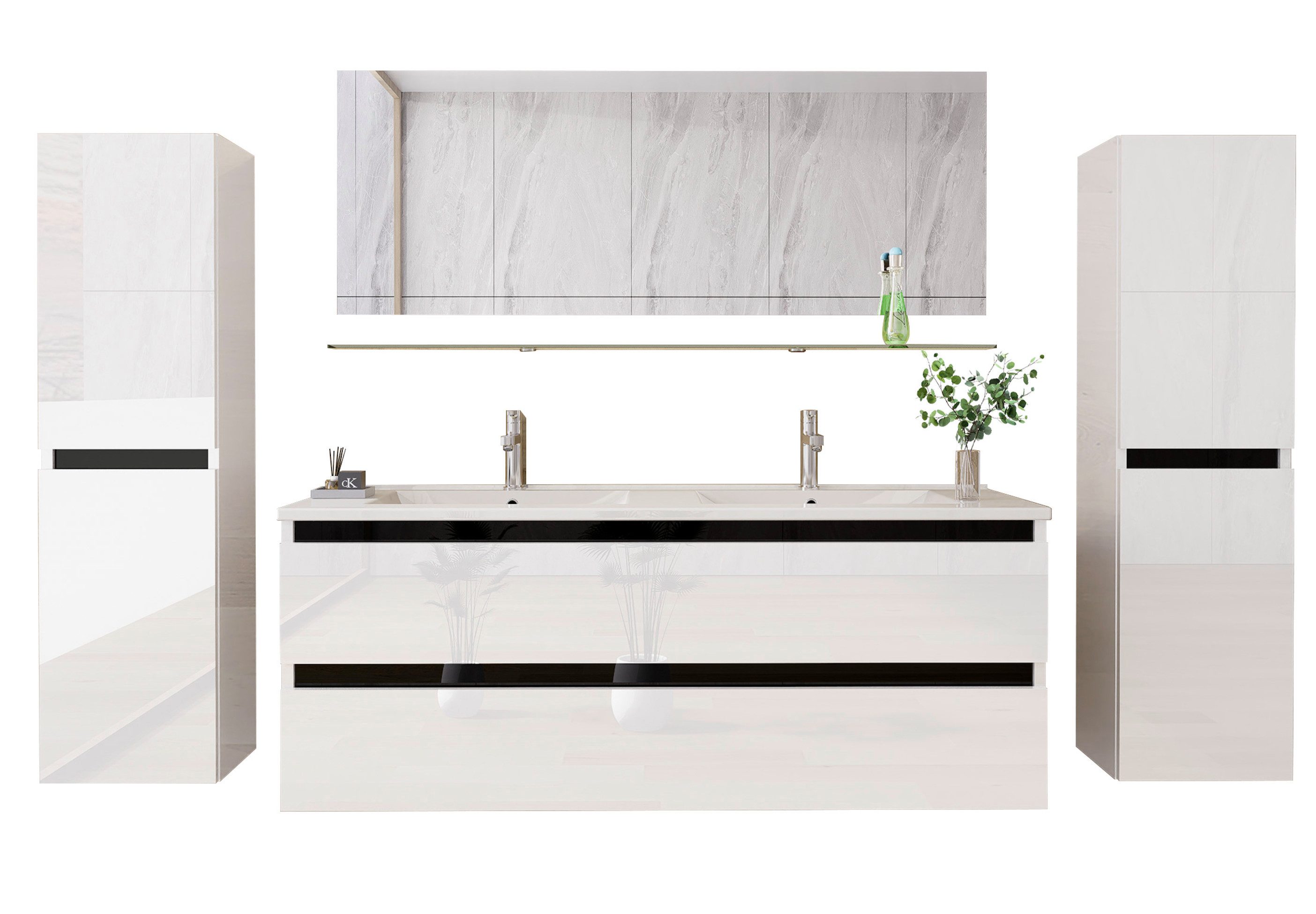 Badmöbelset 8 Teilig Hochglanz Fronten und Seiten Weiß mit Schwarzer Streifen.
