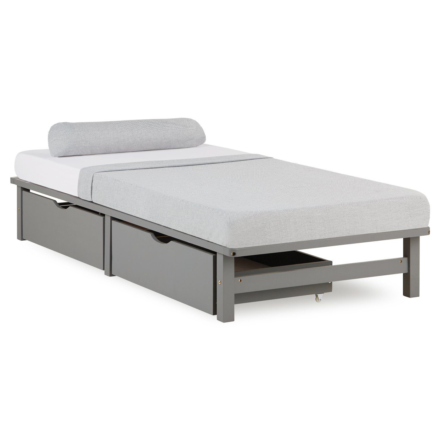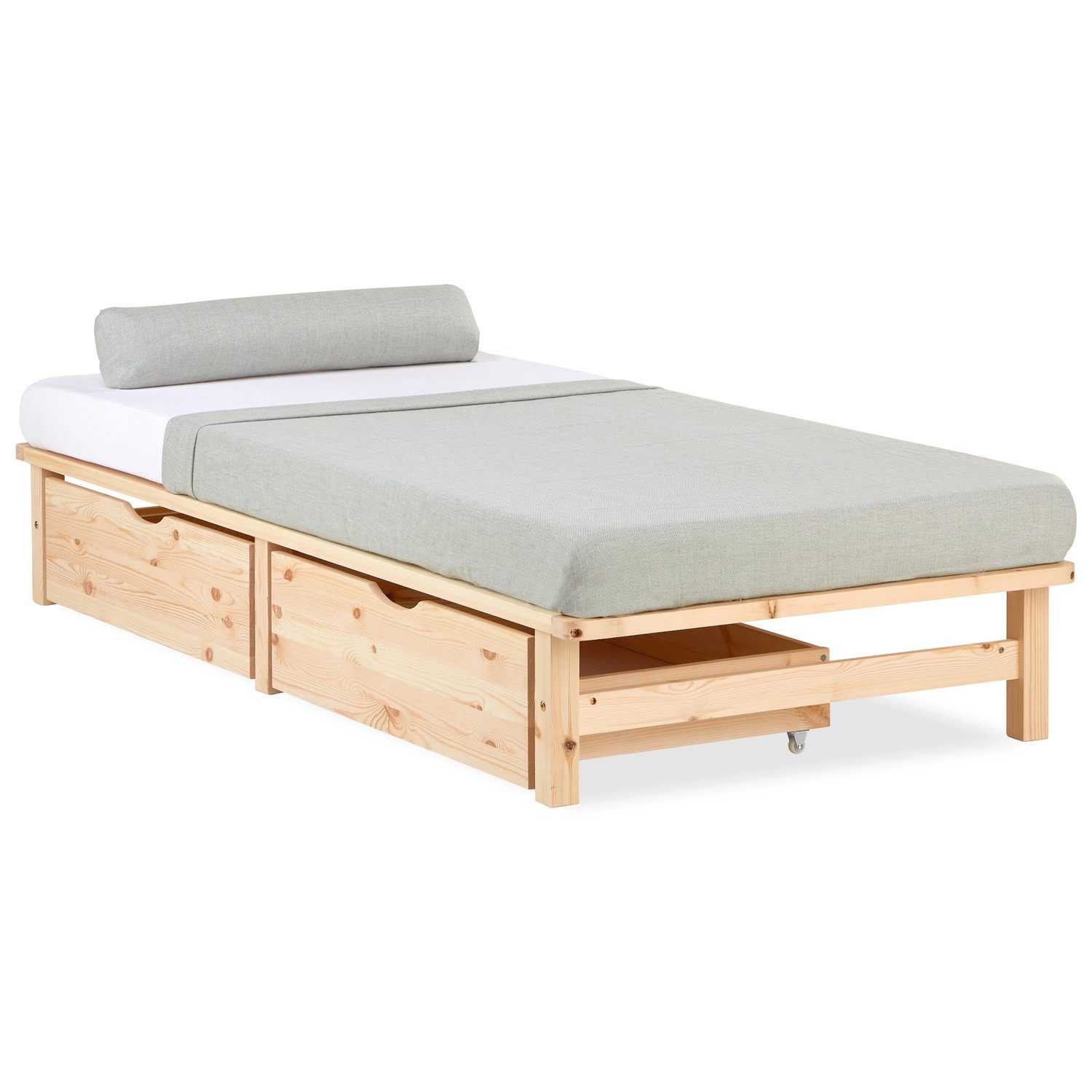 Praktisches Bettkastenset bestehend aus 2 einzelnen Unterbettkommoden für zusätzlichen Stauraum unter Ihrem Bett im Schlafzimmer. Die 2 großen und stabilen Schubkästen sorgen für Ordnung und bieten Platz für Bettwäsche, Kissen, Decken, Kleidung und andere Utensilien. Die Bettschubladen sind beidseitig mithilfe von leichtgängigen Rollen unter dem Bettgestell einfach ausziehbar. Die Unterbettkästen wurden aus massivem Kiefernholz gefertigt und eignen sich daher auch optimal als Erweiterung zu unseren Holzbetten. Die Aufbewahrungsboxen werden zerlegt geliefert und erfordern Montage. Die Lieferung erfolgt per Paketdienst. Die Bett Auszüge sind die perfekte Ergänzung für unsere weißen Palettenbetten.