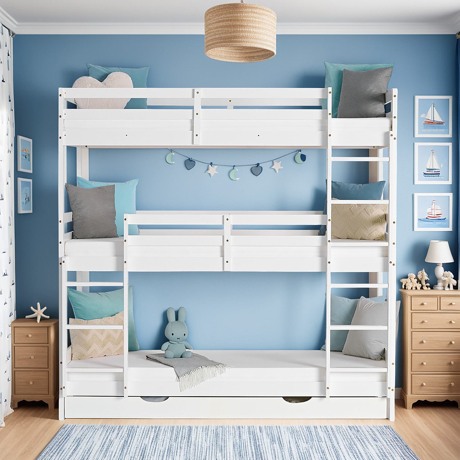 Das moderne Etagenbett für Kinder ist mit 3 Liegeflächen in 90x200 cm und mit einer Leiter vorn und einer an der Seite ausgestattet. Das Kinderhochbett kann als ideale Schlafmöglichkeit oder Spielbett im Kinderzimmer bzw. Jugendzimmer oder auch für spontanen Besuch im Gästezimmer genutzt werden. Das platzsparende und multifunktionale Dreifach-Etagenbett für bis zu 3 Personen ist daher besonders gut für Familien mit mehreren Kindern geeignet. Das praktische Stockbett mit drei Schlafplätzen verfügt über eine große Bettschublade auf Rollen für mehr Stauraum unter dem Bett. In dieser können Kissen, Bettdecken oder Spielzeug verstaut werden. Das aus Kieferholz gefertigte Hochbett ist deckend weiß lackiert. Die einzelnen Etagen des Kinderbetts sind über zwei Leitern zu erreichen. Je nach Raumkonstellation können die Leitern links oder rechts montiert werden. Das Dreifachbett lässt sich nicht in mehrere Einzelbetten umbauen. Drei Rolllattenroste und Matratzen, welche den ruhigen und erholsamen Schlaf Ihrer Kinder unterstützen, sind bereits inklusive, sodass sie nach einem anstrengenden Tag wieder Kraft für neue Abenteuer tanken können. Das Bett wird zerlegt geliefert und erfordert Montage. Die Lieferung erfolgt per Paketdienst.