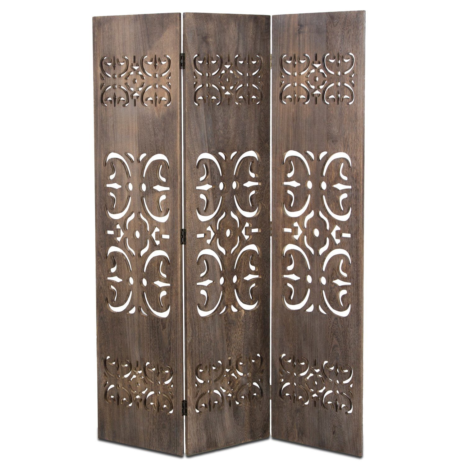 Mit diesem 3-teiligen Paravent lassen Sie ein neues Wohngefühl in Ihr Zuhause einziehen. Als stilvoller Raumtrenner oder Sichtschutz sorgt dieser für eine behagliche Atmosphäre in jedem Wohnbereich. Der stabile Rahmen des Paravents besteht aus grau in Washed Optik lackiertem Paulownia Holz, welches die Holzstruktur erkennen lässt. Der Raumteiler ist mit dekorativen Schnitzereien und Mustern versehen. Diese bewegliche Wand lässt sich einfach auf- und zusammenklappen, und lässt sich problemlos und platzsparend bei Nichtgebrauch wegräumen. Details: 3-teiliger Paravent, dekorative Holzschnitzereien beidseitig und Ornamente, zusammenklappbar, leicht aufzustellen, Scharniere in beide Richtungen klappbar, für den Innenbereich geeignet, Lieferung erfolgt komplett montiert, Material und Farbe: Rahmen aus Paulowniaholz in Braun Washed, Maße: Höhe: 170 cm Breite: 120 cm Tiefe: ca. 2 cm , Breite der einzelnen Elemente: 40 cm , Lieferumfang: 3-teiliger Paravent fertig montiert, Lieferung erfolgt per Paketdienst