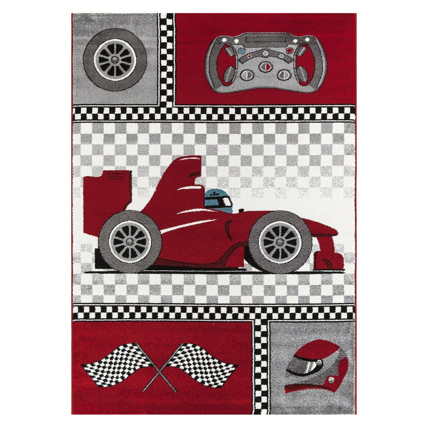 Bringen Sie mit unserem rechteckigen Kinderteppich das aufregende Rennwagen-Feeling ins Kinderzimmer. Hergestellt aus pflegeleichtem und strapazierfähigem Polypropylen ist dieser Teppich ideal für Spiel- und Kinderzimmer, ideal für kleine Rennfahrer und Rennfahrerinnen. Das auffällige Muster mit Rennwagen und Verkehrszeichen in verschiedenen Farben schafft eine fröhliche und lebendige Atmosphäre im Raum.