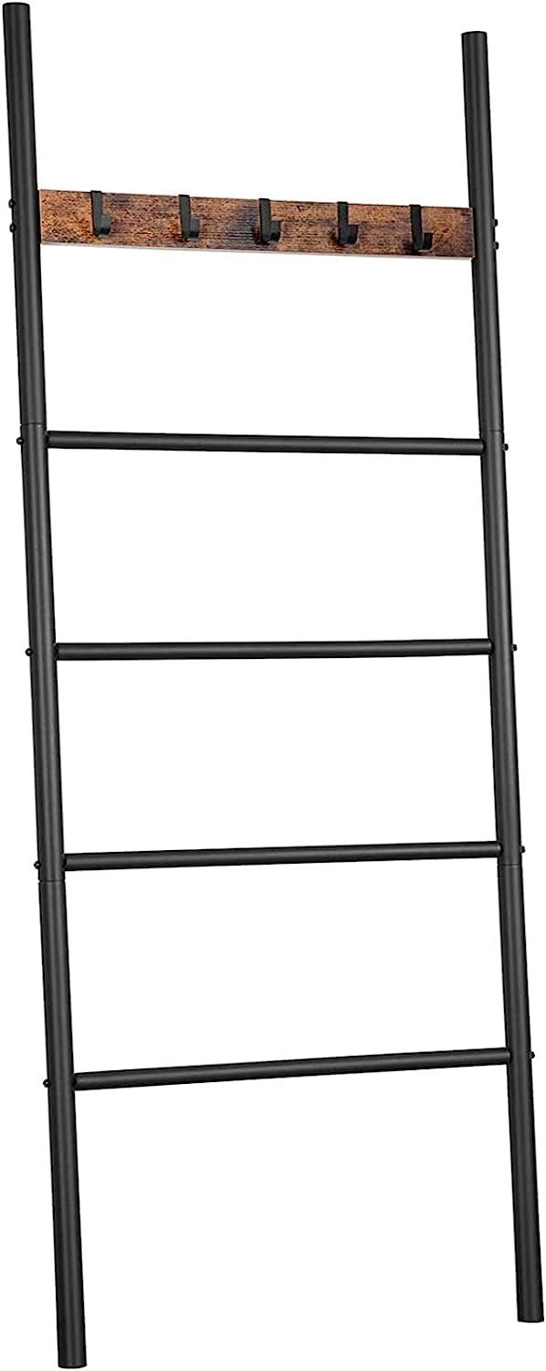 HOOBRO Handtuchleiter, Handtuchständer, Handtuchhalter, Kleiderständer, 5 abnehmbare Haken, 60 x 177 cm, für Badetücher, Kleidung, Decken, Zeitungen, platzsparend, Stabil, Industriestil HOOBRO Handtuchleiter 60 x 177 cm 5 abnehmbare Haken Dieser Handtuchständer ist ein absolutes Muss für Ihr Heimleben! Leiterregal kann nicht nur im Badezimmer zum Aufhängen von Badetüchern, sondern auch im Schlafzimmer zur Aufbewahrung von Kleidungsstücken und als Zeitungs- und Zeitschriftenablage genutzt werden. Was auch immer das Szenario ist, dieses Handtuchleiter wird Ihre Anforderungen perfekt erfüllen. Lieferumfang: 1 x Handtuchleiter 1 x Montagezubehör 1 x Anleitung(DE,EN,IT,ES,FR) Farbe: Dunkelbraun, Schwarz Material: Holzspanplatte, Metall Größe: 60 x 177 cm (L x H) Gewicht: 3,27 kg Schick und funktionell Wie die Oberseite sich von der Wand lehnt, wodurch Sie Decken oder Handtücher schichten können,ohne dass es die Wand berührt und Flecken vermeidet. Zusätzliche Verwendung von Haken Die Haken können entfernt werden und Sie können den Abstand zwischen den Haken anpassen oder auf andere Stangen wechseln Sehr gut verarbeitet Die Oberfläche der Eisenstangen hat einen mattierter mattierten Lack, der die Funktion des Rostschutzes hat und für den Dauereinsatz im Bad- oder Saunabereich geeignet ist.