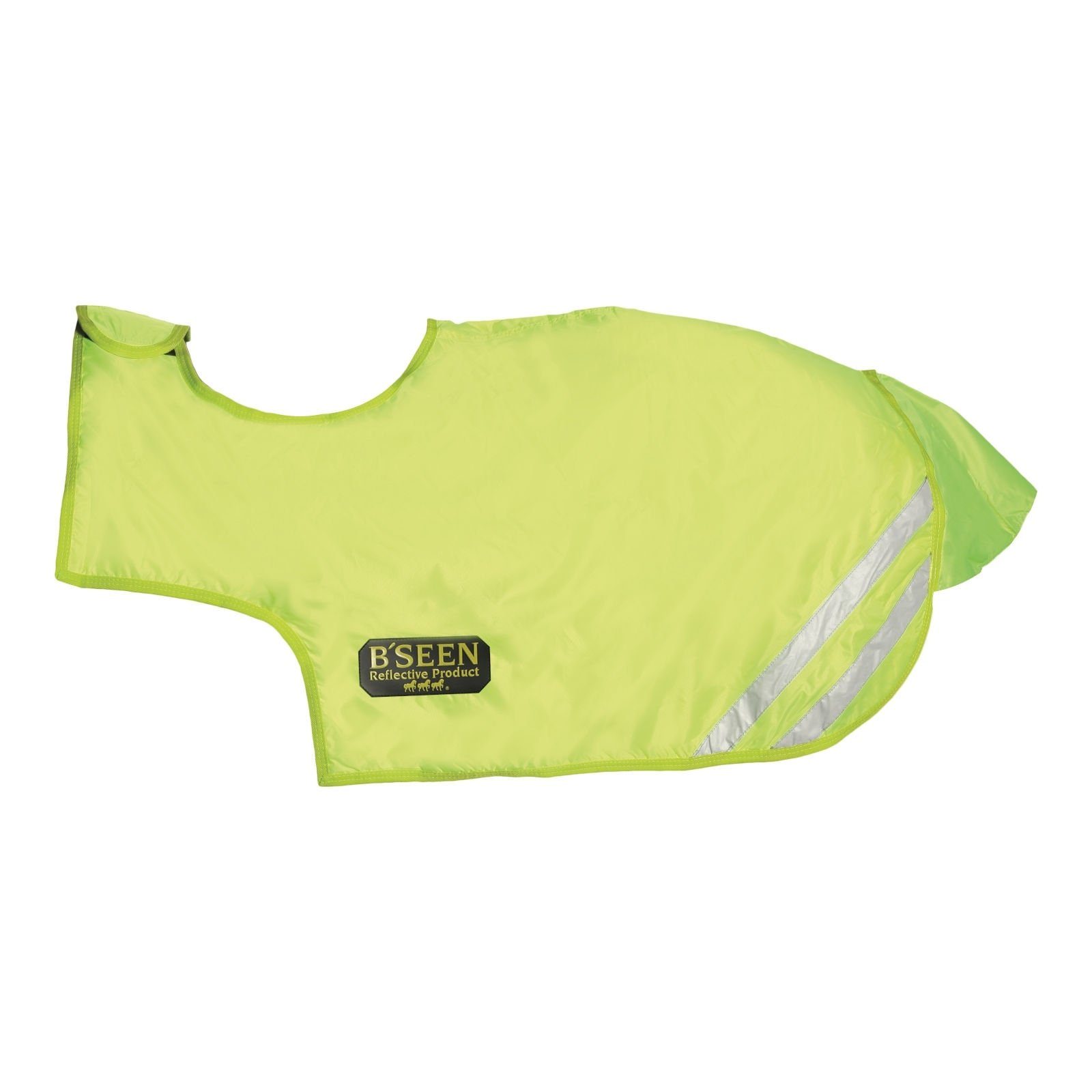Reflektierende Ausreitdecke für Pferde aus wasserabweisendem und fluoreszierendem Material mit Reflexbesatz und Schweiflatz.