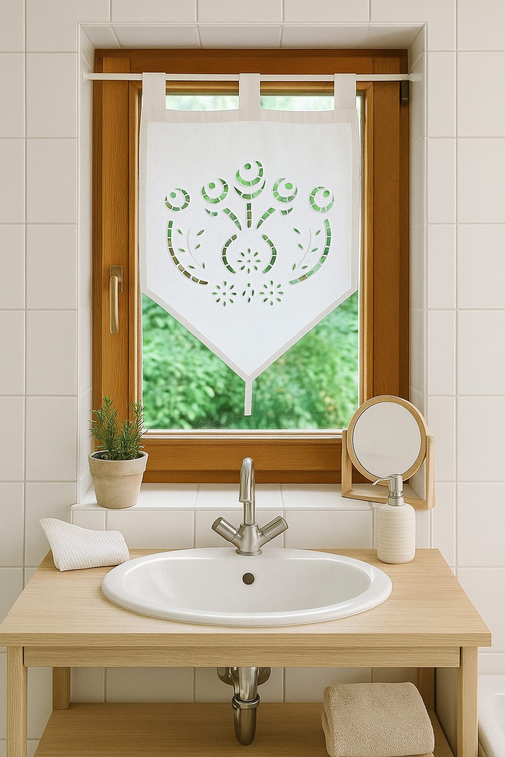 Gefertigt aus 100% Baumwolle, überzeugt die Fensterdekoration mit hochwertiger Optik und angenehmer Haptik. Vorder- und Rückseite sind gleichermaßen dekorativ, sodass der Vorhang von innen wie von außen eine geschmackvolle Wirkung erzielt.