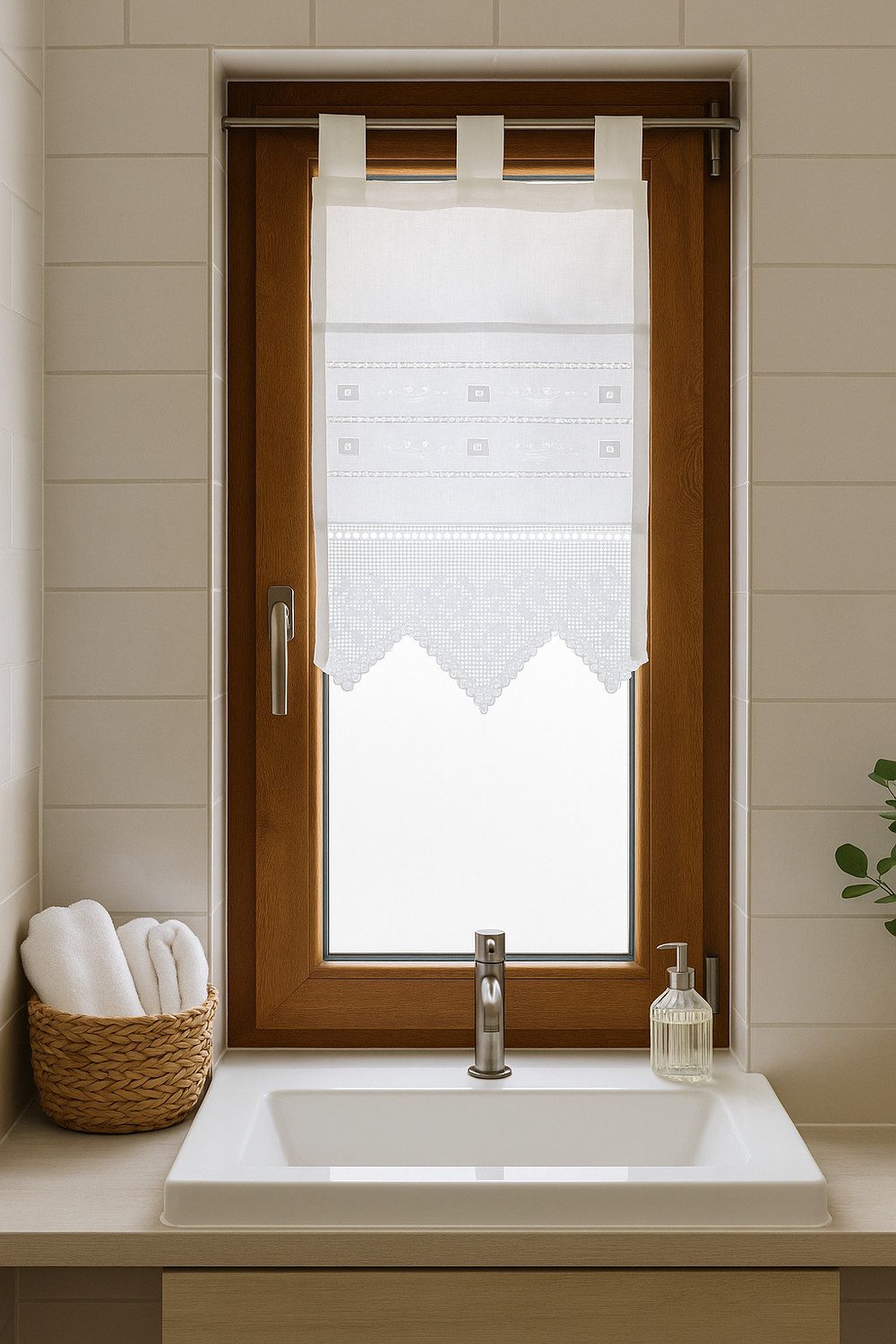 Dieser elegante Fenstervorhang sorgt für eine stilvolle und romantische Atmosphäre in Ihrem Zuhause. Der halbtransparente Stoff aus 100 % Baumwolle in Weiß lässt sanft das Licht durchscheinen und schafft ein gemütliches Ambiente. Highlight ist die von Hand gehäkelte Spitze mit Durchzug, die den Vorhang zu einem besonderen Blickfang macht.
