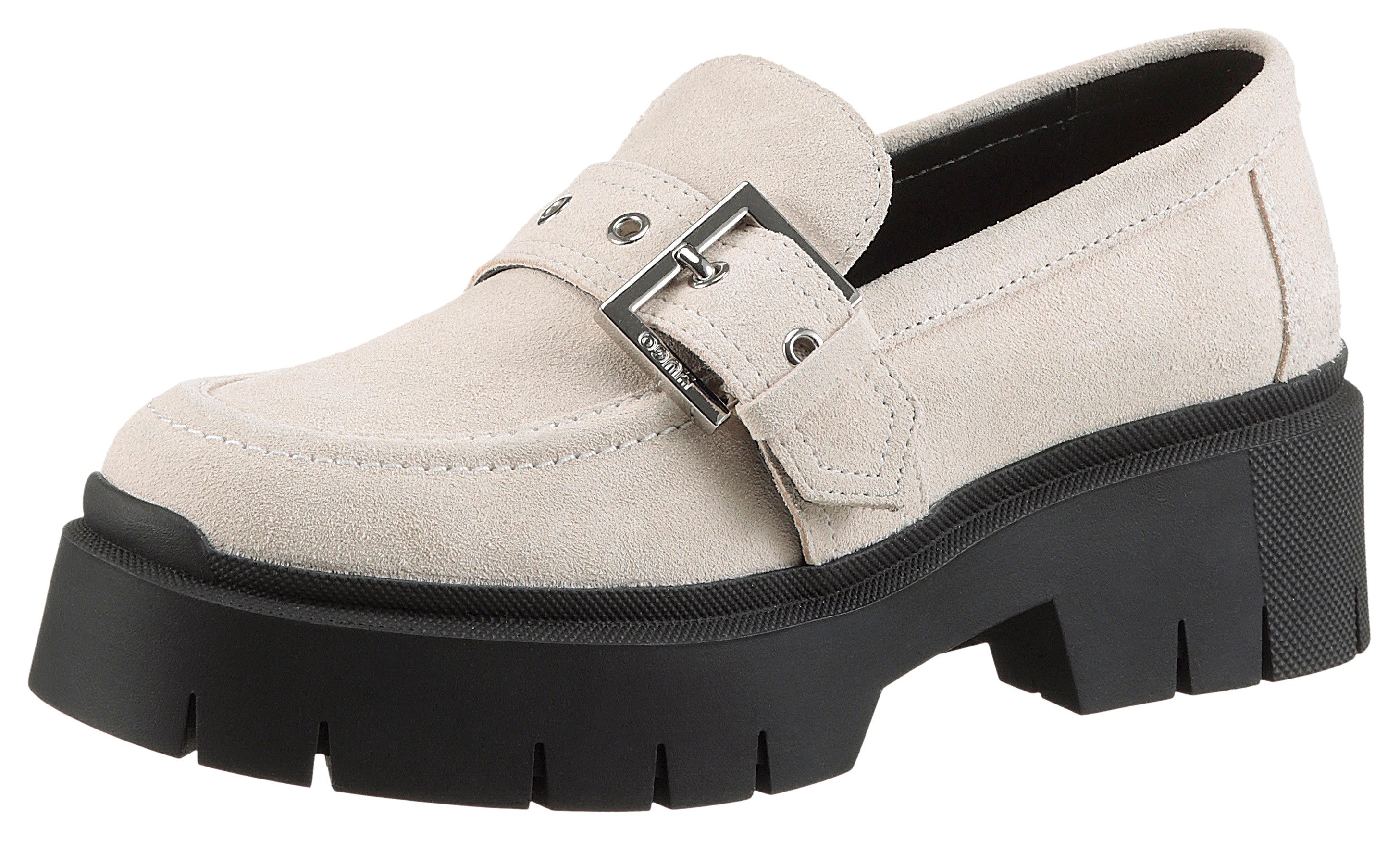 Mit dem Obermaterial aus Veloursleder sind die Schuhe weich und langlebig. Die Synthetik-Sohle der Loafer ist stark profiliert und sorgt für mehr Rutschfestigkeit auf unebenem Untergrund. Der Plateauabsatz machen der Loafer komfortabel für den ganzen Tag. Diese Loafer in Weite F sind für schmale bis normale Füße geeignet.