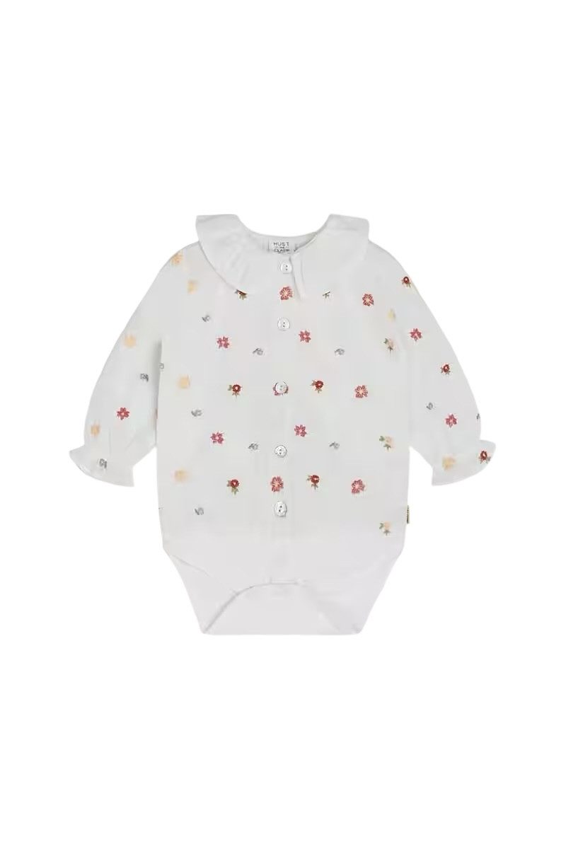 Hust & Claire Baby-Body BERNADDETTE – Langarmbody-Bluse mit romantischer Stickerei & Rüschenkragen in Weiß. Entdecke den bezaubernden Baby-Body BERNADDETTE von Hust & Claire – eine stilvolle Kombination aus Body und Bluse. Mit feiner Blumenstickerei auf Vorder- und Rückseite, einem eleganten Rüschenkragen und detailverliebten Knöpfen bietet dieser Body einen klassischen, niedlichen Look für besondere Anlässe oder den Alltag. Die langen Ärmel mit feinen Rüschen an den Bündchen verleihen dem Design eine verspielte Note. Gefertigt aus 100 % hautfreundlicher Bio-Baumwolle, sorgt das Material für höchsten Tragekomfort – ideal für empfindliche Babyhaut. Die durchgehende Knopfleiste vorne ermöglicht ein einfaches An- und Ausziehen. Der Body ist nicht nur wunderschön, sondern auch praktisch – ein echtes Must-have für jede Baby-Garderobe!