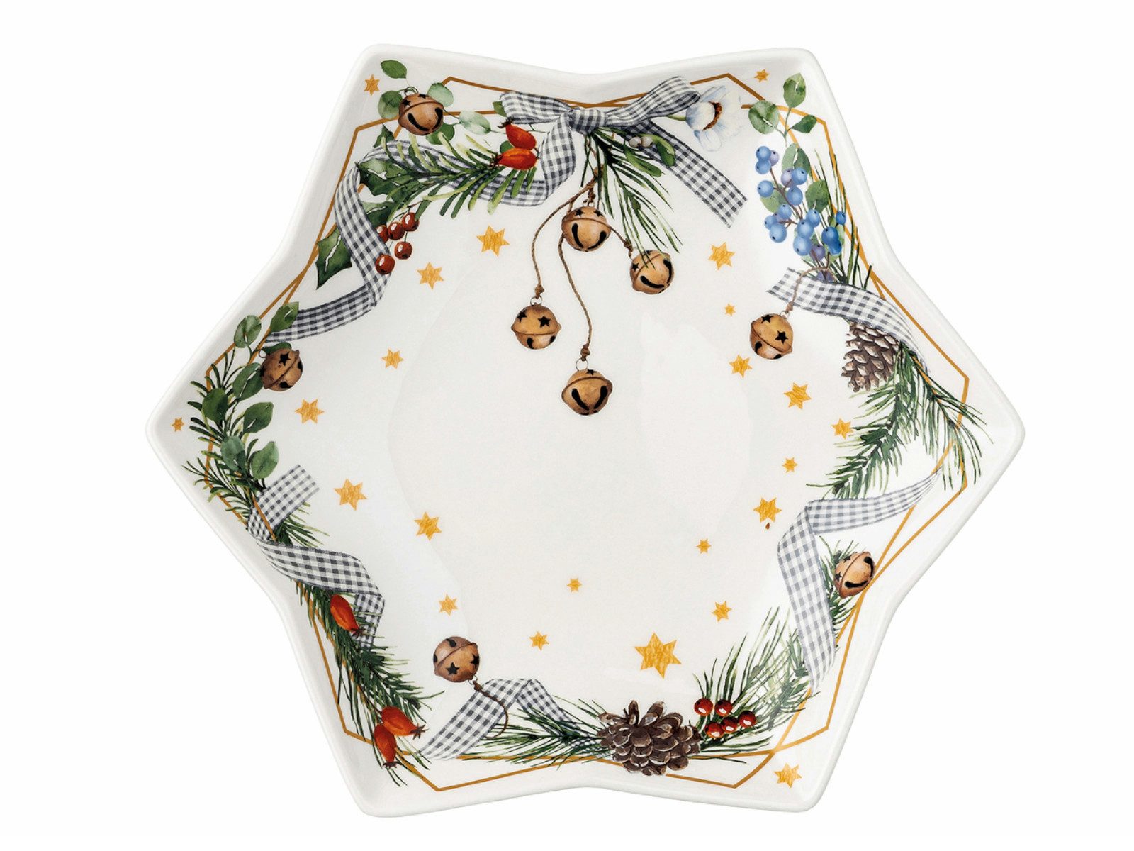 Mit einem Durchmesser von 24 cm bietet die Sternschale großzügigen Platz für Weihnachtsleckereien, kleine Dekorationen oder als stilvolles Präsentationsstück auf Ihrem Tisch. Die feinen Goldakzente und die kunstvollen Motive tragen zur festlichen Atmosphäre bei und machen die Schale zu einem echten Blickfang.