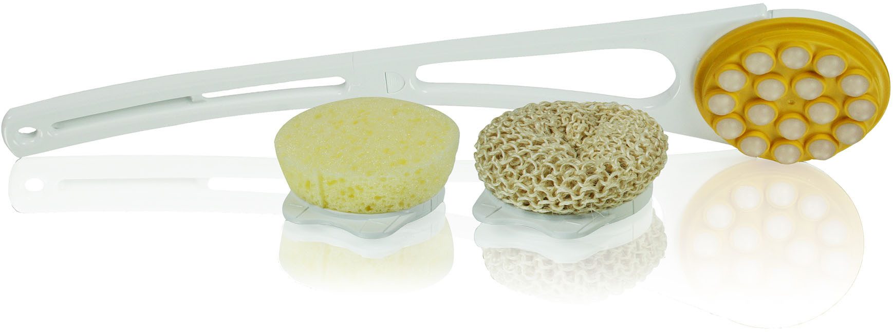 Anwendung | Eincreme-Aufsatz mit 17 Massagekugeln für Cremes, Lotionen, BodyMilk Schwamm-Aufsatz zur Reinigung des Körpers z.B. mit Duschgel Sisal-Aufsatz befreit den Körper von abgestorbenen Hautzellen |