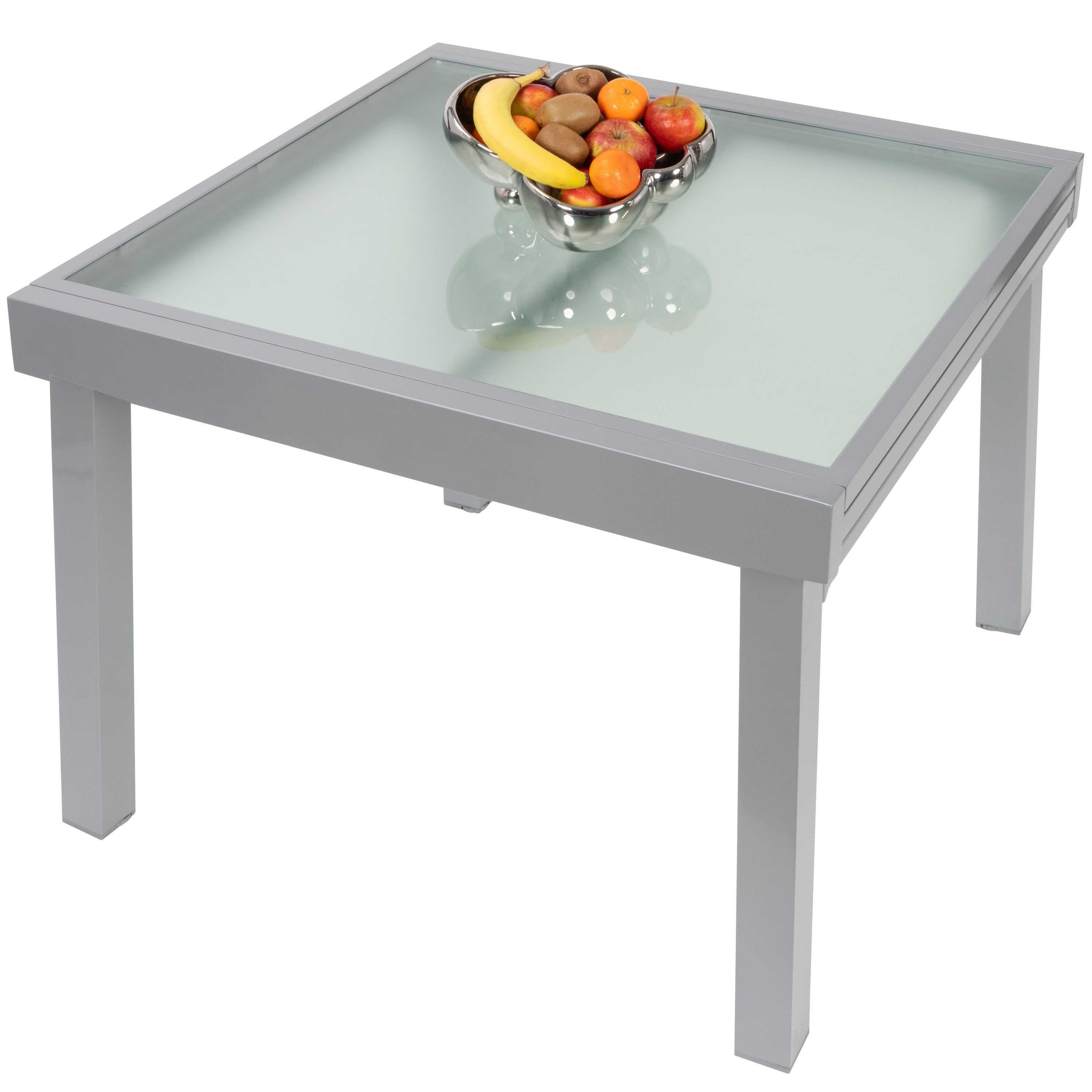 Der Diplomat Gartentisch bietet Platz für bis zu 8 Personen und eignet sich somit ideal für Familienfeiern, Grillabende oder einfach nur zum Entspannen auf der Terrasse. Ein besonderes Merkmal dieses Tisches ist die große helle Pearl-Glasplatte, die dem Gartentisch eine edle und hochwertige Ausstrahlung verleiht. Die ausziehbare Tischplatte ist besonders leicht zu reinigen und bietet somit eine praktische Lösung für den Einsatz im Freien. Dank des intelligenten Mechanismus lassen sich die beiden Tischplatten mühelos verschieben und sicher arretieren. So können Sie schnell und einfach von der kompakten 90 cm auf die doppelte Длина von 180 cm erweitern.