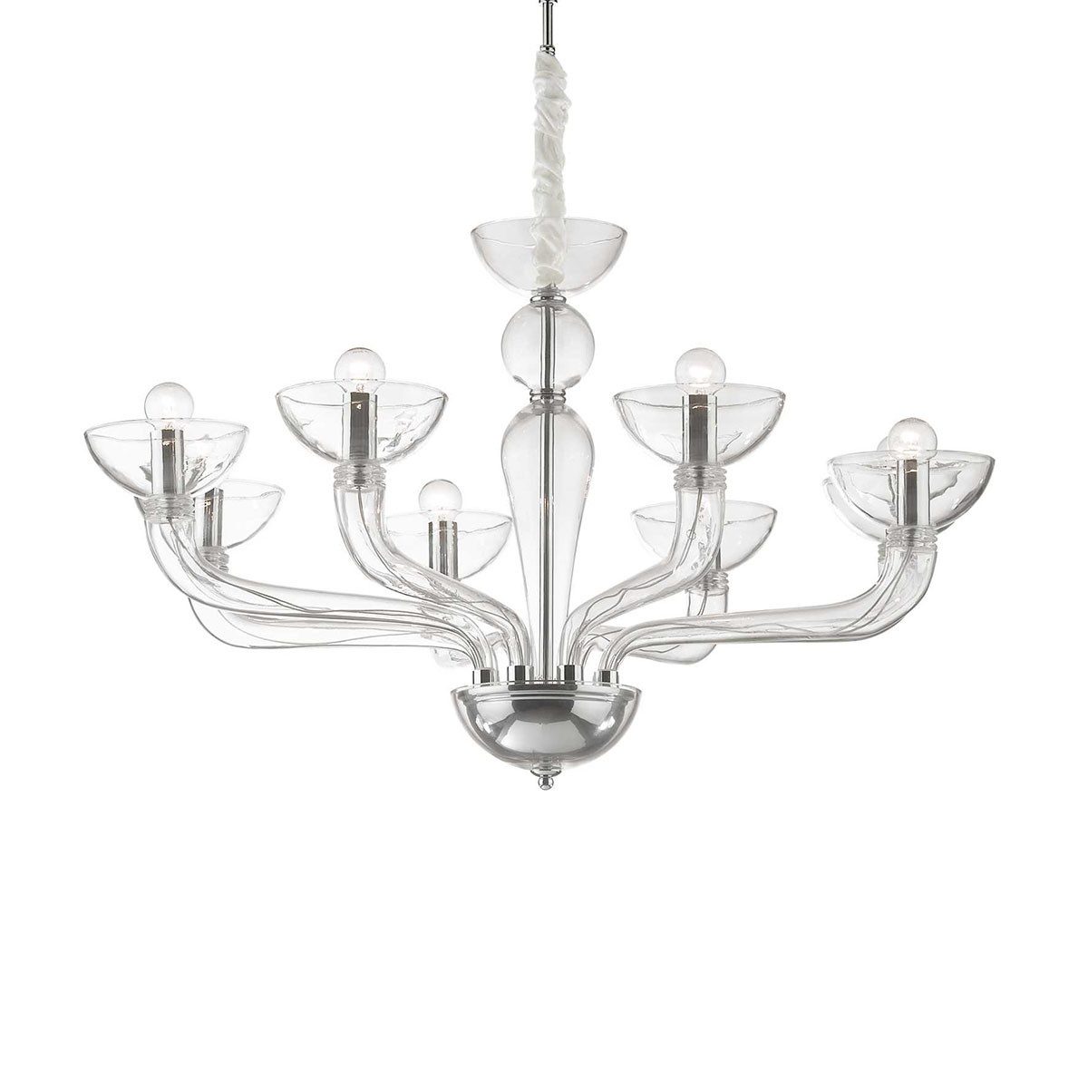 Der Casanova Kronleuchter von Ideal Lux vereint klassische Formen mit modernen Farbakzenten. Seine geschwungenen Glasarme, filigranen Details und funkelnden Kristalle machen ihn zum eleganten Blickfang – perfekt für stilvolle Wohn- oder Essbereiche.