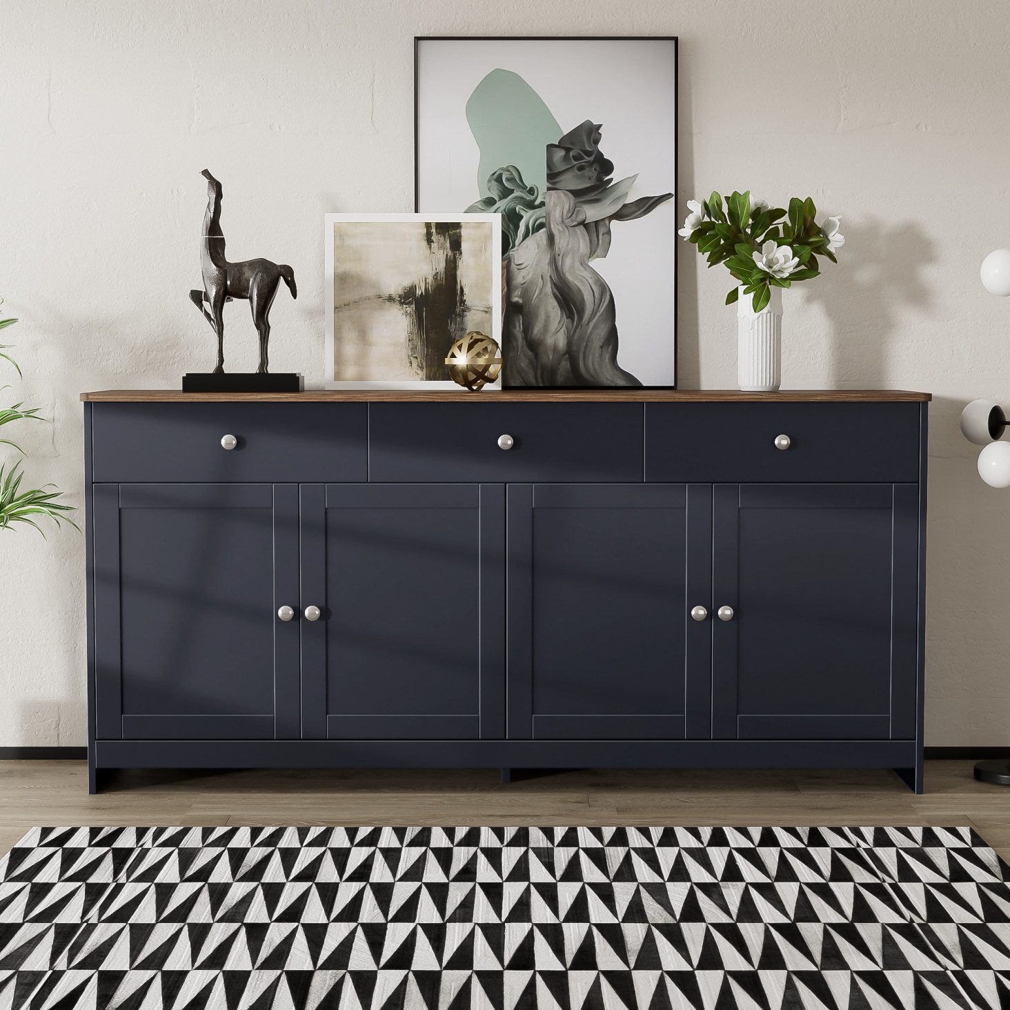 Mit vier geräumigen Türenfächern und drei praktischen Schubladen bietet dieses Sideboard organisierte Aufbewahrung für Geschirr, Tischdekoration oder Wohnaccessoires. Die verstellbaren Regalböden ermöglichen flexible Höhenanpassung - ideal für hohe Servierplatten oder stapelbare Dessertschalen. Die 160cm Breite bietet ausreichend Platz für die Unterbringung von Küchengeräten in offenen Küchenkonzepten.