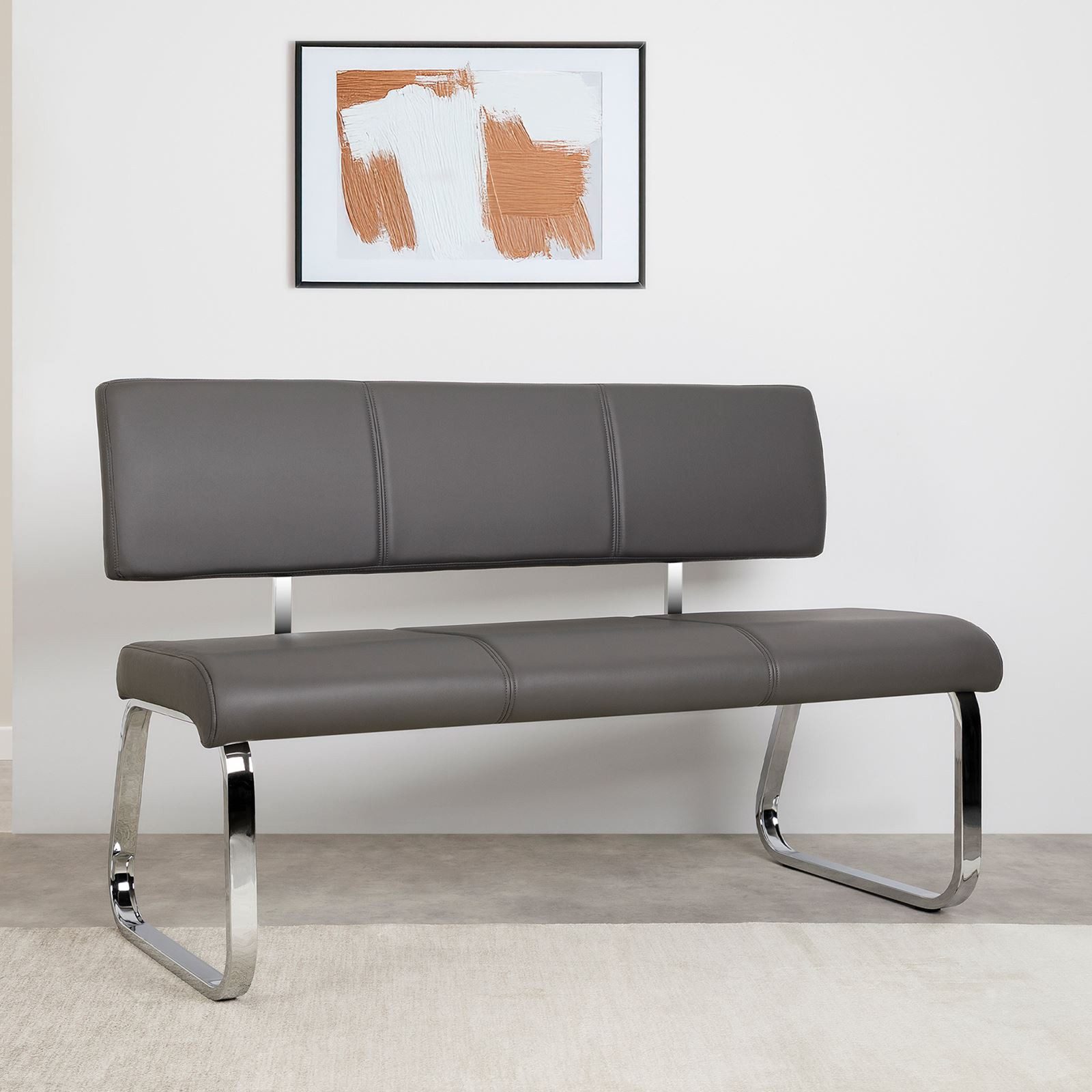Die VILAS Essbank in elegantem Hellgrau vereint Komfort mit modernem Design. Mit einem robusten, silbernen Metallgestell und einem hochwertigen, grauen Kunstlederbezug bietet diese Sitzbank nicht nur eine bequeme Sitz- und Rückenpolsterung, sondern auch stilvolle Optik für jedes Esszimmer. Die Küchenbank mit Lehne bietet drei Personen gemütlich Platz, ideal für gemeinsame Mahlzeiten und gesellige Stunden.