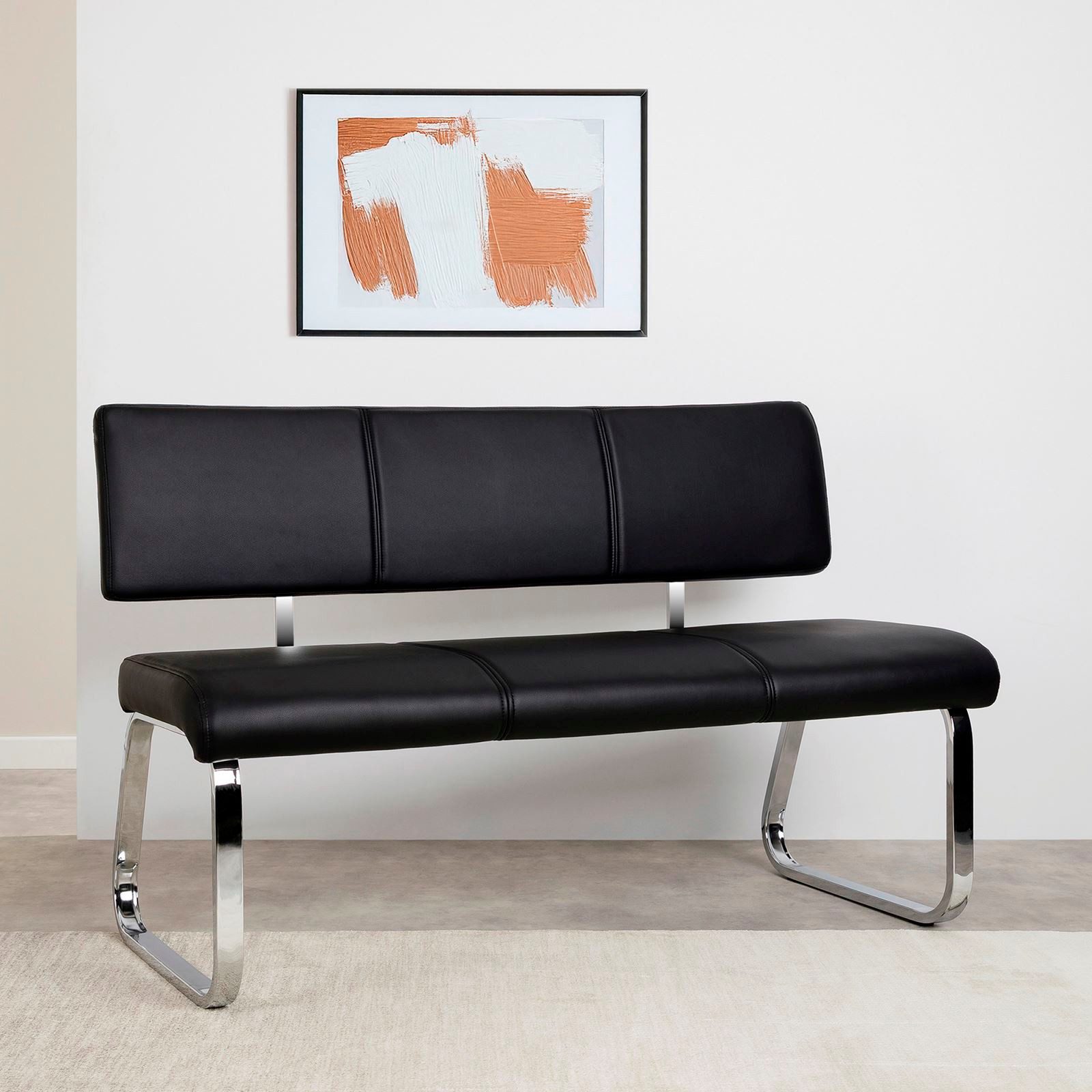 Die VILAS Essbank in elegantem Hellgrau vereint Komfort mit modernem Design. Mit einem robusten, silbernen Metallgestell und einem hochwertigen, schwarzen Kunstlederbezug bietet diese Sitzbank nicht nur eine bequeme Sitz- und Rückenpolsterung, sondern auch stilvolle Optik für jedes Esszimmer. Die Küchenbank mit Lehne bietet drei Personen gemütlich Platz, ideal für gemeinsame Mahlzeiten und gesellige Stunden.