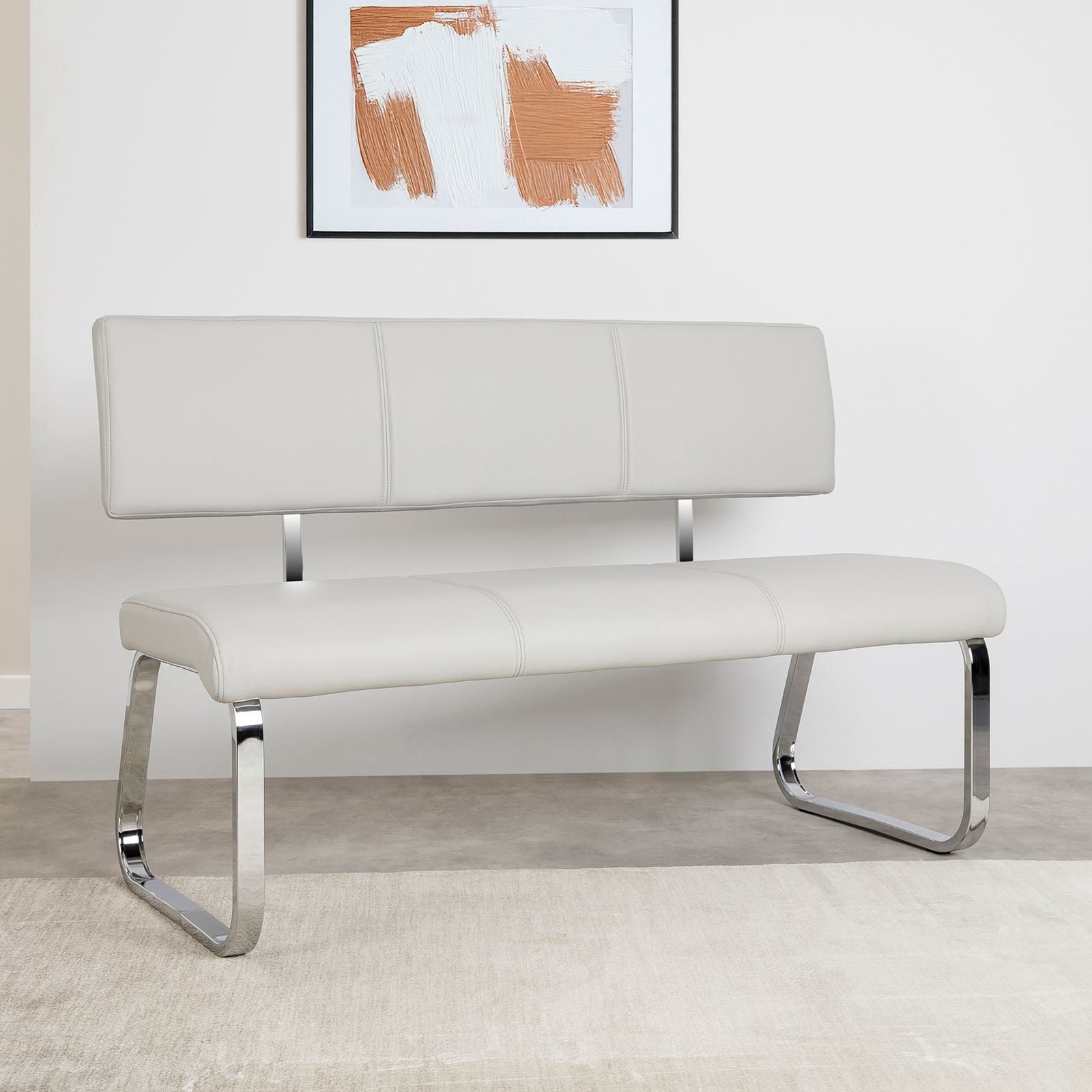 Die VILAS Essbank in elegantem Hellgrau vereint Komfort mit modernem Design. Mit einem robusten, silbernen Metallgestell und einem hochwertigen, hellgrauen Kunstlederbezug bietet diese Sitzbank nicht nur eine bequeme Sitz- und Rückenpolsterung, sondern auch stilvolle Optik für jedes Esszimmer. Die Küchenbank mit Lehne bietet drei Personen gemütlich Platz, ideal für gemeinsame Mahlzeiten und gesellige Stunden.