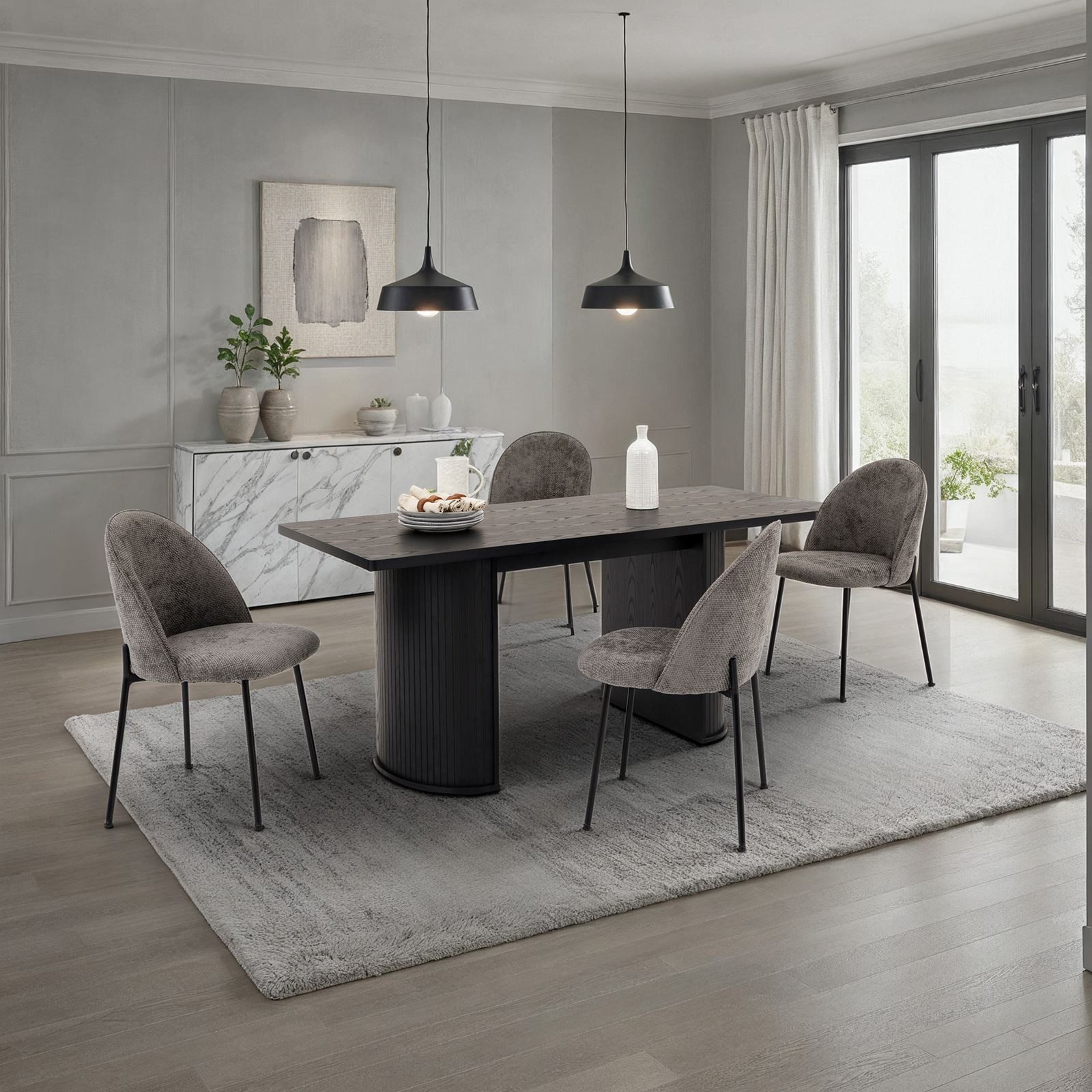 Diese moderne Kombination aus Tisch und Stühlen vereint ein elegantes Design mit praktischer Funktionalität. Der rechteckige Tisch mit stilvollen Beinen und die bequemen Sitzmöbel schaffen eine gemütliche Atmosphäre für gesellige Mahlzeiten.