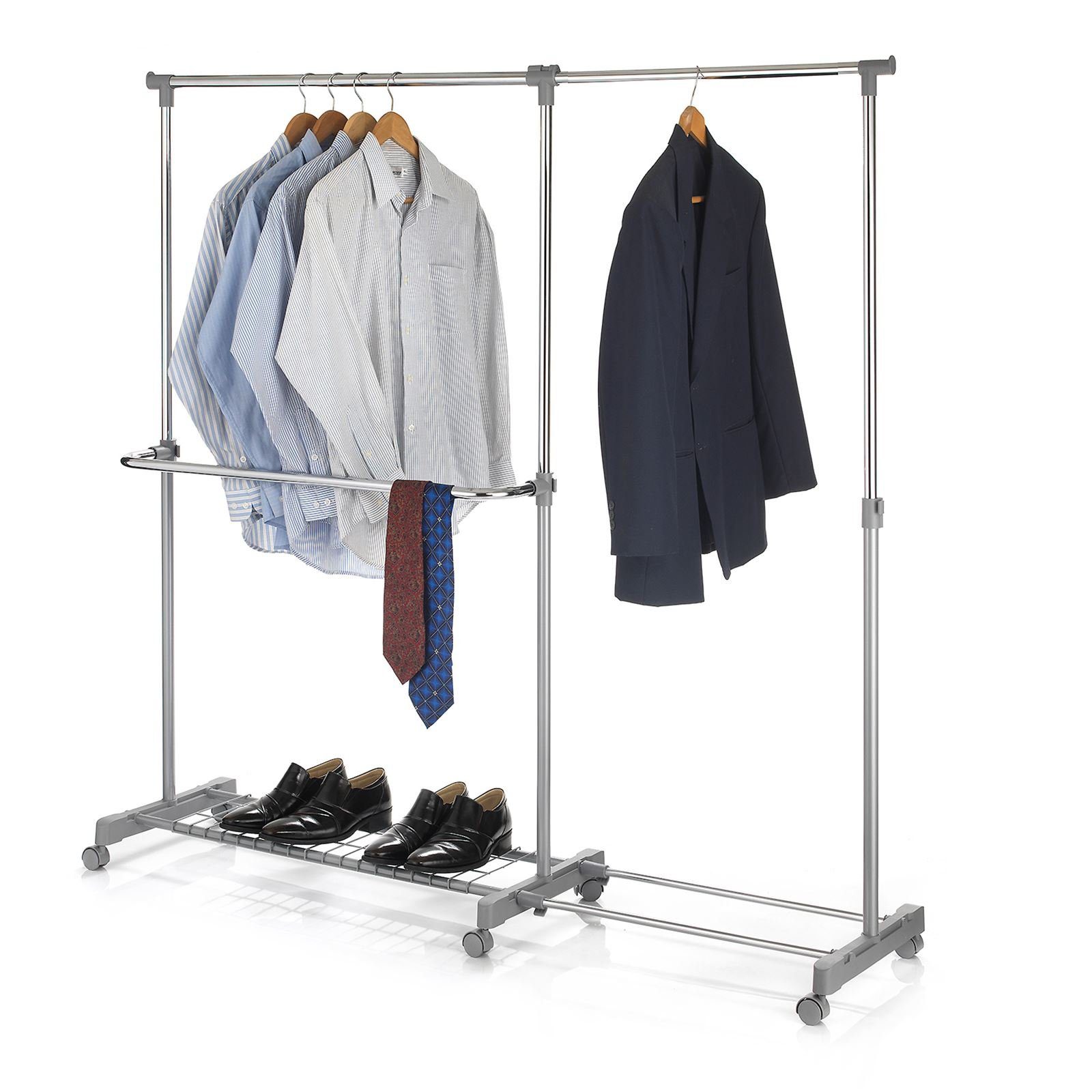 ist ideal wenn Sie viele Kleidungsstücke besitzen die schnell zerknittern. An 2 Stangen können hier Hemden, Blusen und Jackets aufgehängt werden. Wenn Platz gespart werden muss, ist der Garderobenwagen schnell in Breite und Höhe verkleinerbar. Sogar ein paar Schuhe finden auf der praktischen Ablage Platz. Die Rollgarderobe LONDON, ein perfekter Begleiter für Schlaf- und Ankleidezimmer.