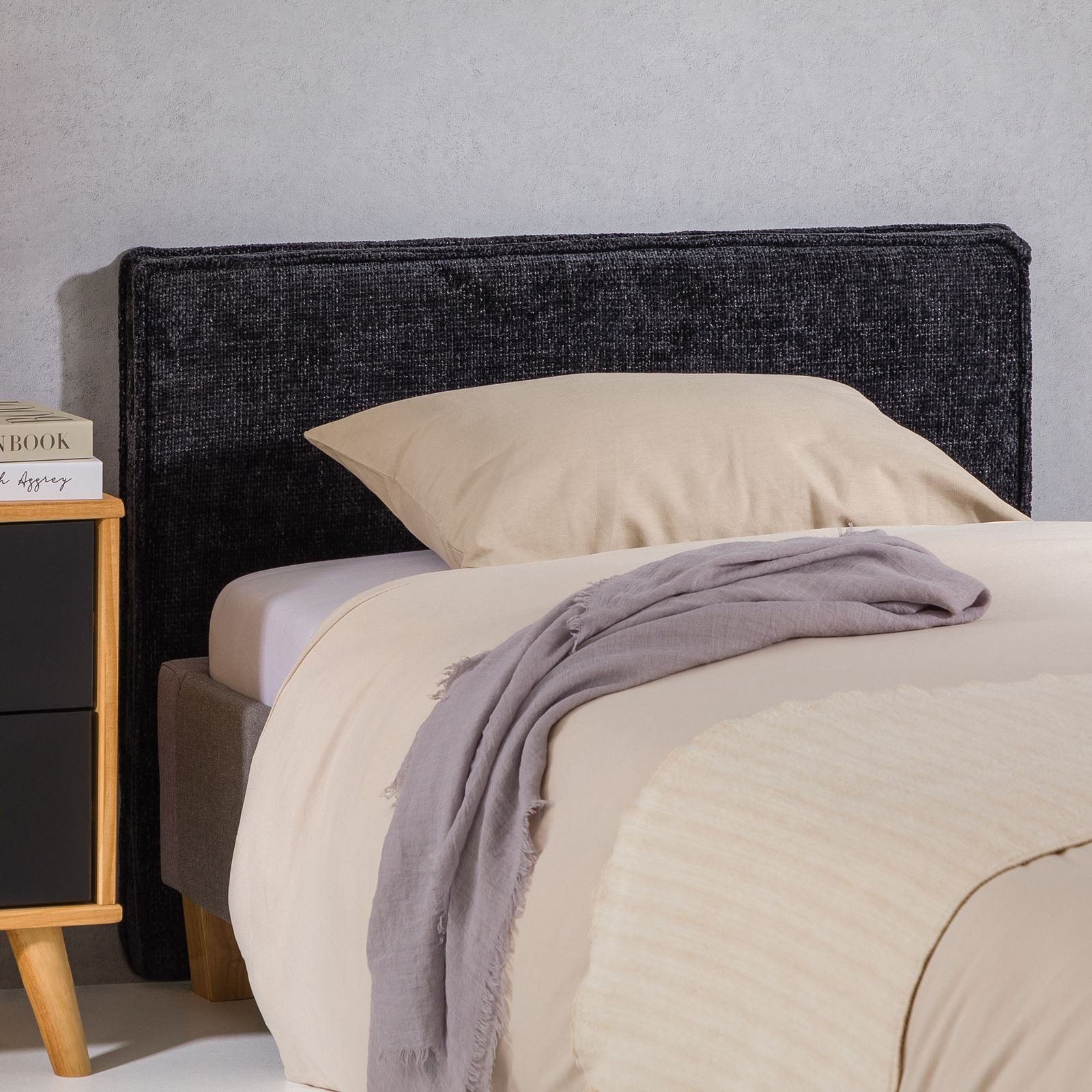 Das Bettkopfteil YOLAN bringt Gemütliche Stimmung in dein Schlafzimmer. Mit seinem strukturierten Chenille-Stoffbezug aus 100% Polyester bleibt es auch bei intensiver Nutzung langlebig und resistent gegen Pilling. Mit ihrer weichen Polsterung sorgt die Bettrückwand für angenehmen Komfort und lädt zum Anlehnen und Entspannen ein, während die stabilen Kunststofffüße sicheren Halt bieten. Das schlichte, eckige Design in Schwarz verleiht dem Bettgestell einen modernen Look.