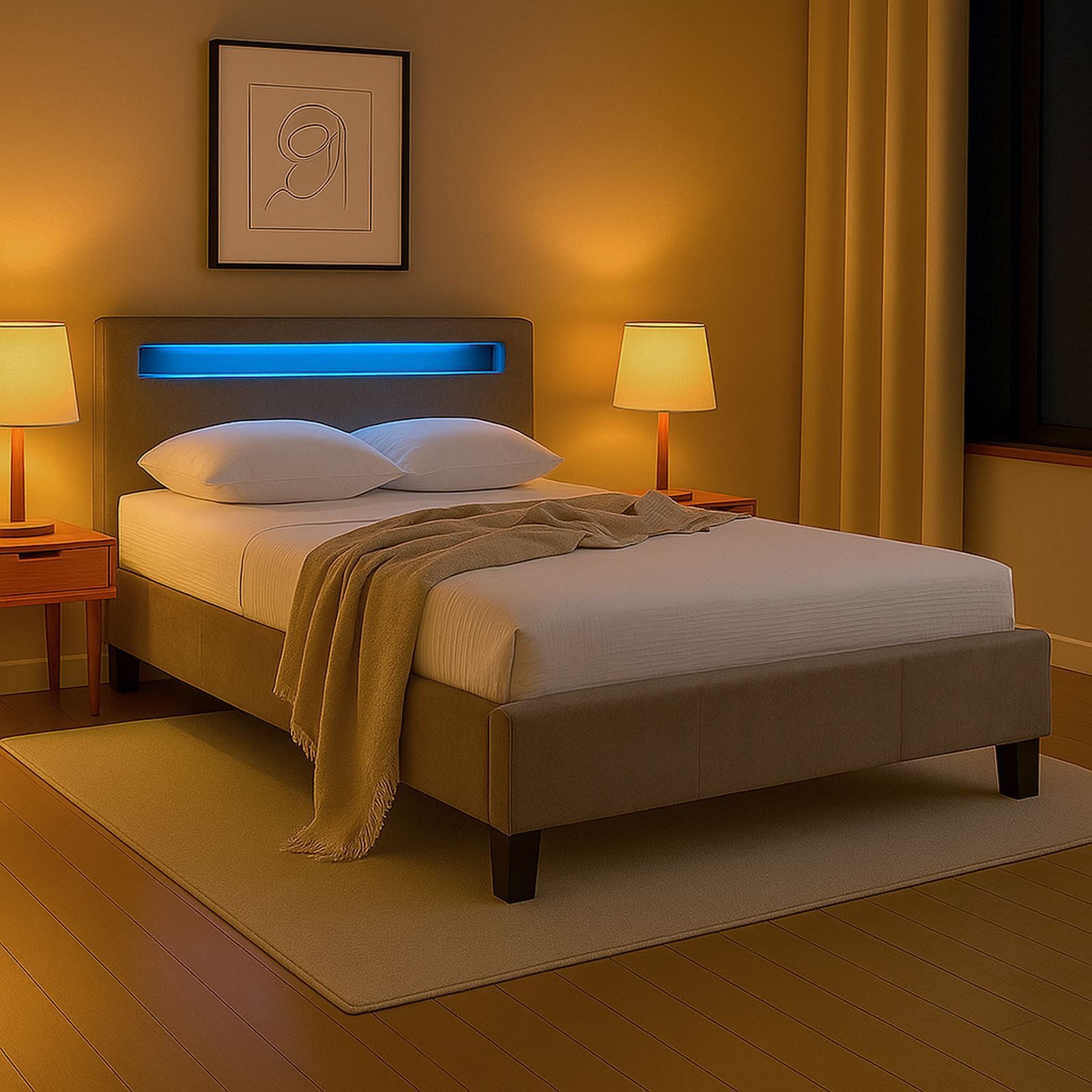 Das Bett LASHIO vereint stilvolles Design mit durchdachtem Komfort. Die LED-Beleuchtung im Kopfteil lässt sich in 7 Farben per Fernbedienung einstellen und sorgt für stimmungsvolle Lichtakzente. Der weiche Stoffbezug und das gepolsterte Kopfteil schaffen eine gemütliche Atmosphäre zum Entspannen. Mit seiner stabilen Bauweise ist das Bett ideal für ein modernes und wohnliches Schlafzimmer oder Jugendzimmer.