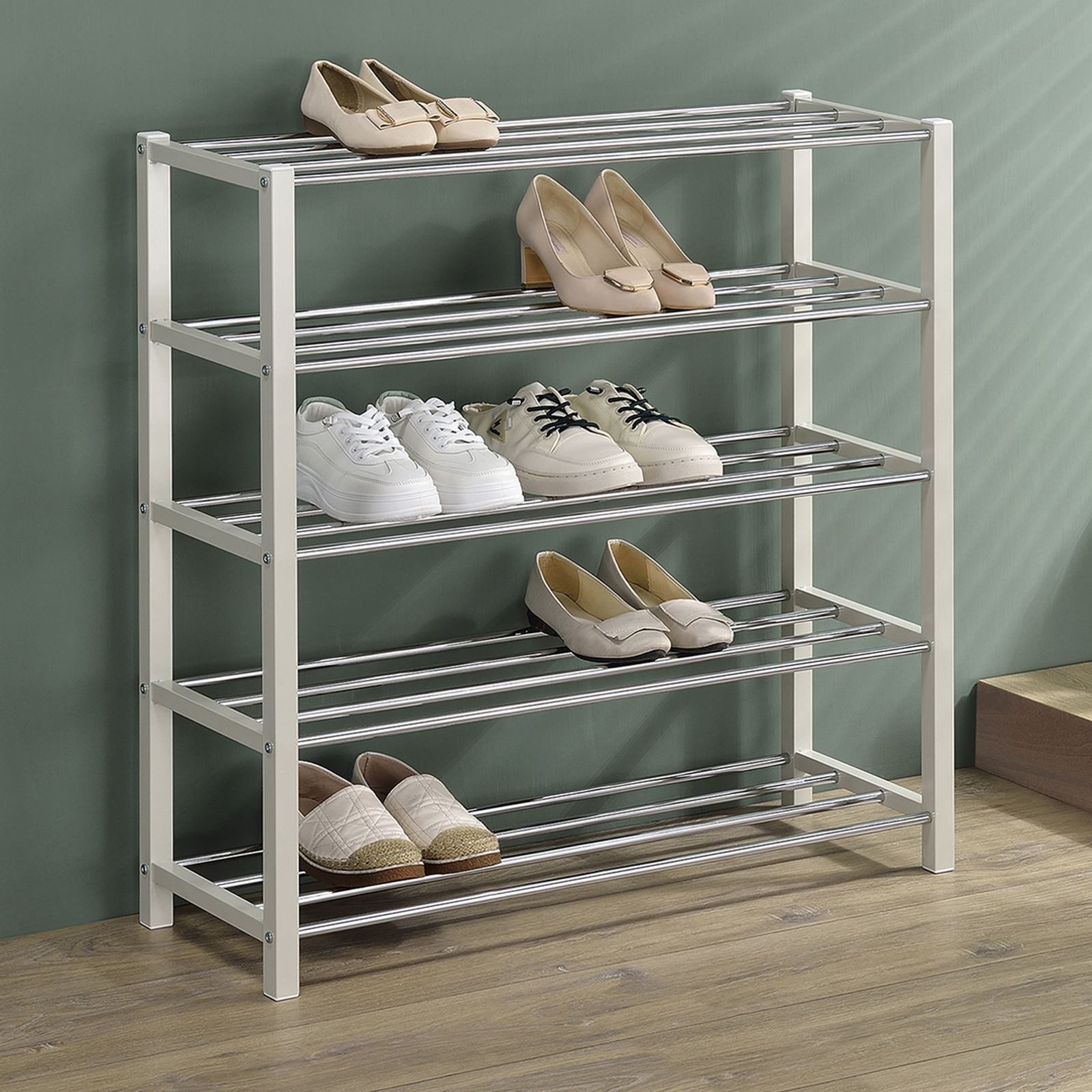 Das Schuhregal DUBLIN bietet mit fünf Ablagen viel Platz zur ordentlichen Aufbewahrung Ihrer Schuhe. Die Konstruktion aus schwarz lackiertem Metall ist stabil und pflegeleicht. Verchromte Rohre sorgen für zusätzliche Stabilität und eine moderne Optik. Dank der kompakten Maße eignet sich das Regal ideal für schmale Flure, Dielen oder Eingangsbereiche.