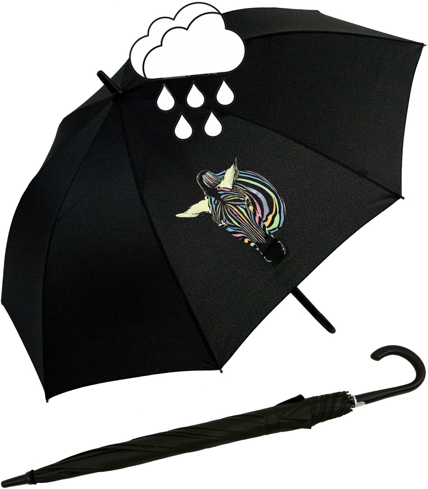 Das Dach dieses großen Stockschirm zeigt einen schwarz-weißen Zebra-Kopf. Bei Nässe jedoch verfärbt dieser sich bunt und macht den Schirm zu einem echten gute-Laune-Accessoire an Regen-grauen Tagen. Die Farbe des Schirmdaches ist schwarz-weiß und bunt bei Nässe, das verwendete Material besteht aus 100% Polyester. Groß und stabil wiegt der Stockschirm nur ca. 460 Gramm. Geöffnet ist das Dach 111 cm groß. Geschlossen misst er 87 cm. Geöffnet wird der Schirm automatisch per Knopfdruck. Der Rundhakengriff liegt gut in der Hand und das Fiberglasgestell macht den Schirm trotz seiner Размер angenehm leicht. So kann dieser auffällige Schirm problemlos auch längere Zeit gut getragen werden.