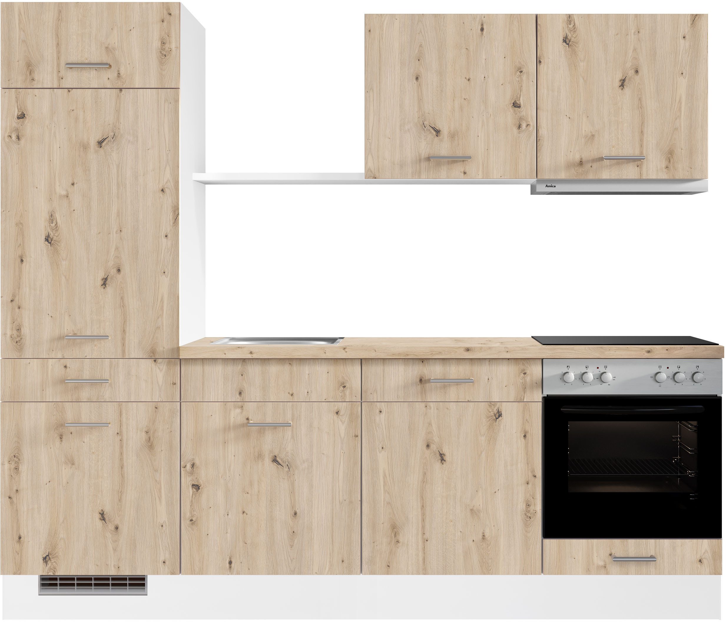 Ausstattung | Durchgehende Arbeitsplatte Einlegeböden höhenverstellbar Schubkästen mit Vollauszug und Soft-Close-Funktion Stabile Metallauszüge inkl. Edelstahl-Einbauspüle, ohne Abtropffläche |