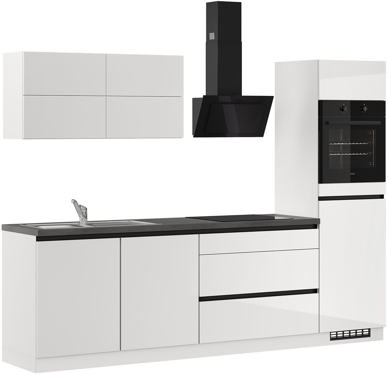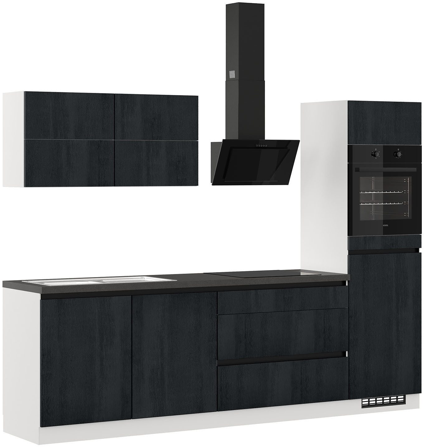 Ausstattung | Durchgehende Arbeitsplatte Einlegeböden höhenverstellbar Schubkästen mit Vollauszug und Soft-Close-Funktion Stabile Metallauszüge inkl. Edelstahl-Einbauspüle, mit Abtropffläche |