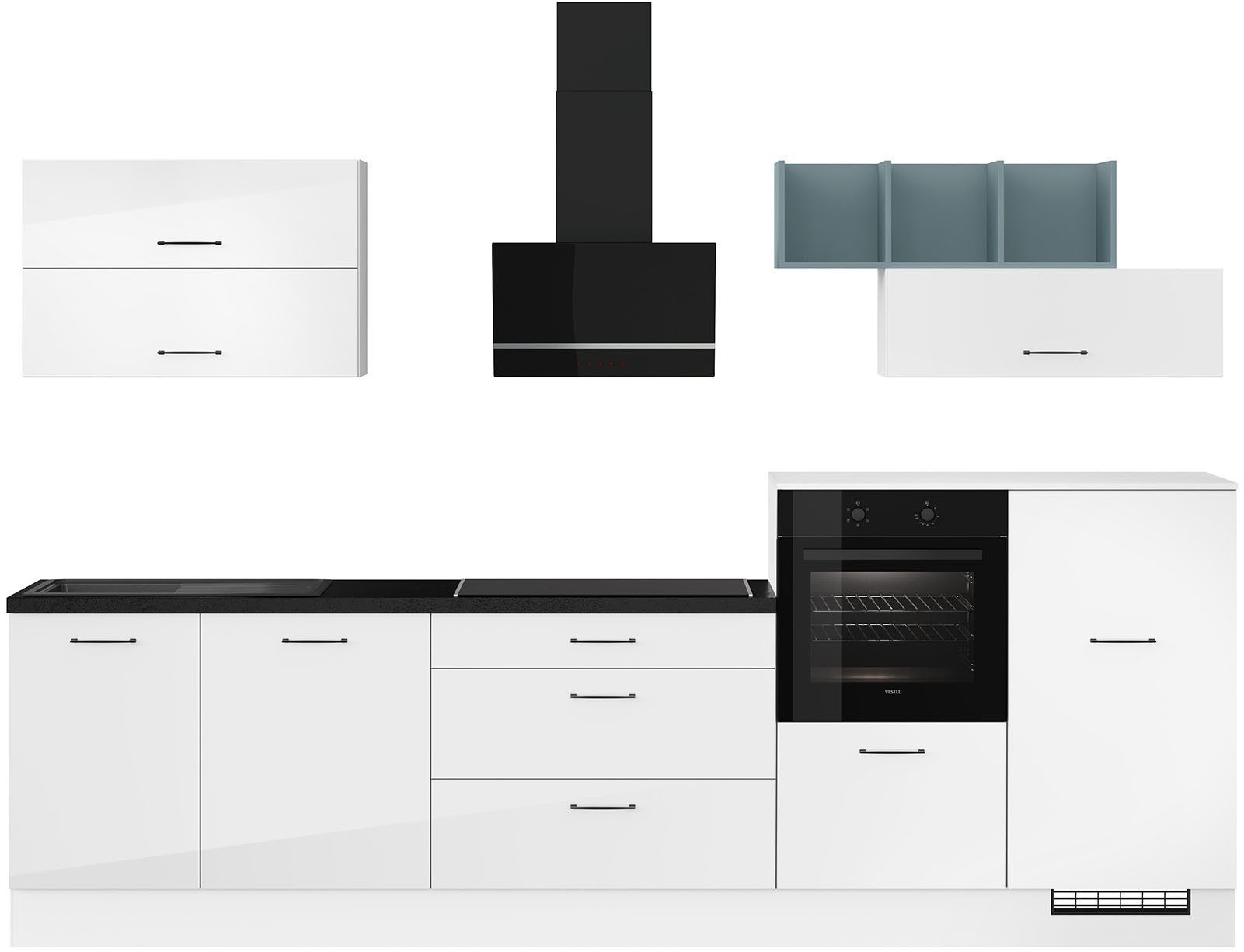 Set beinhaltet | 2x Highboard für Einbaugeräte 60cm Akzentregal 90cm Arbeitsplatte b: 200cm Eckblende für Unterschränke Frontplatte für vollintegrierten Geschirrspüler 60cm Granit-Einbauspüle Schwarz Hängeschrank mit Klappe 90cm Sockel Spülen-Unterschrank 50cm Unterschrank für Kochmulde 90cm Wangenboden b: 120,2cm |