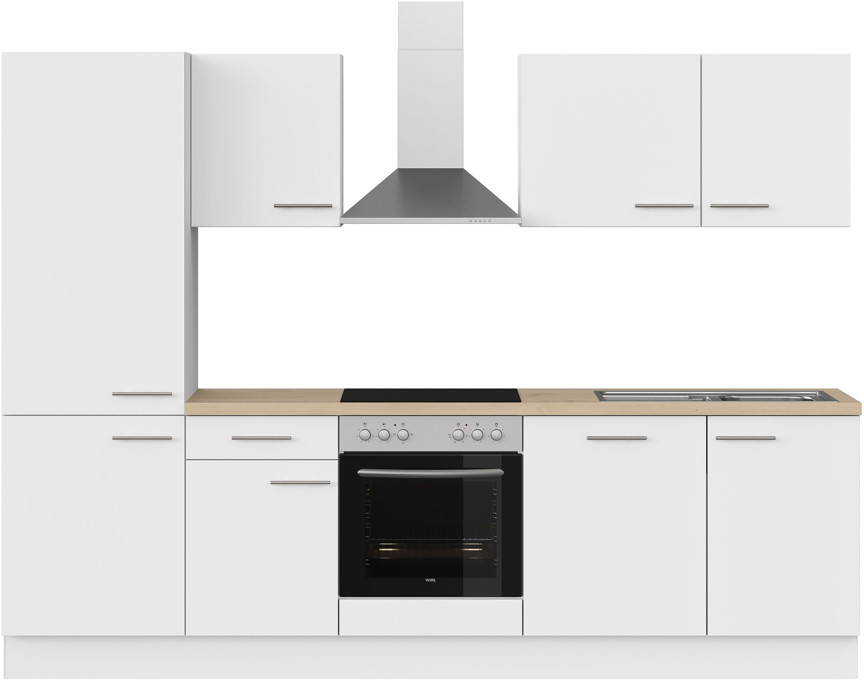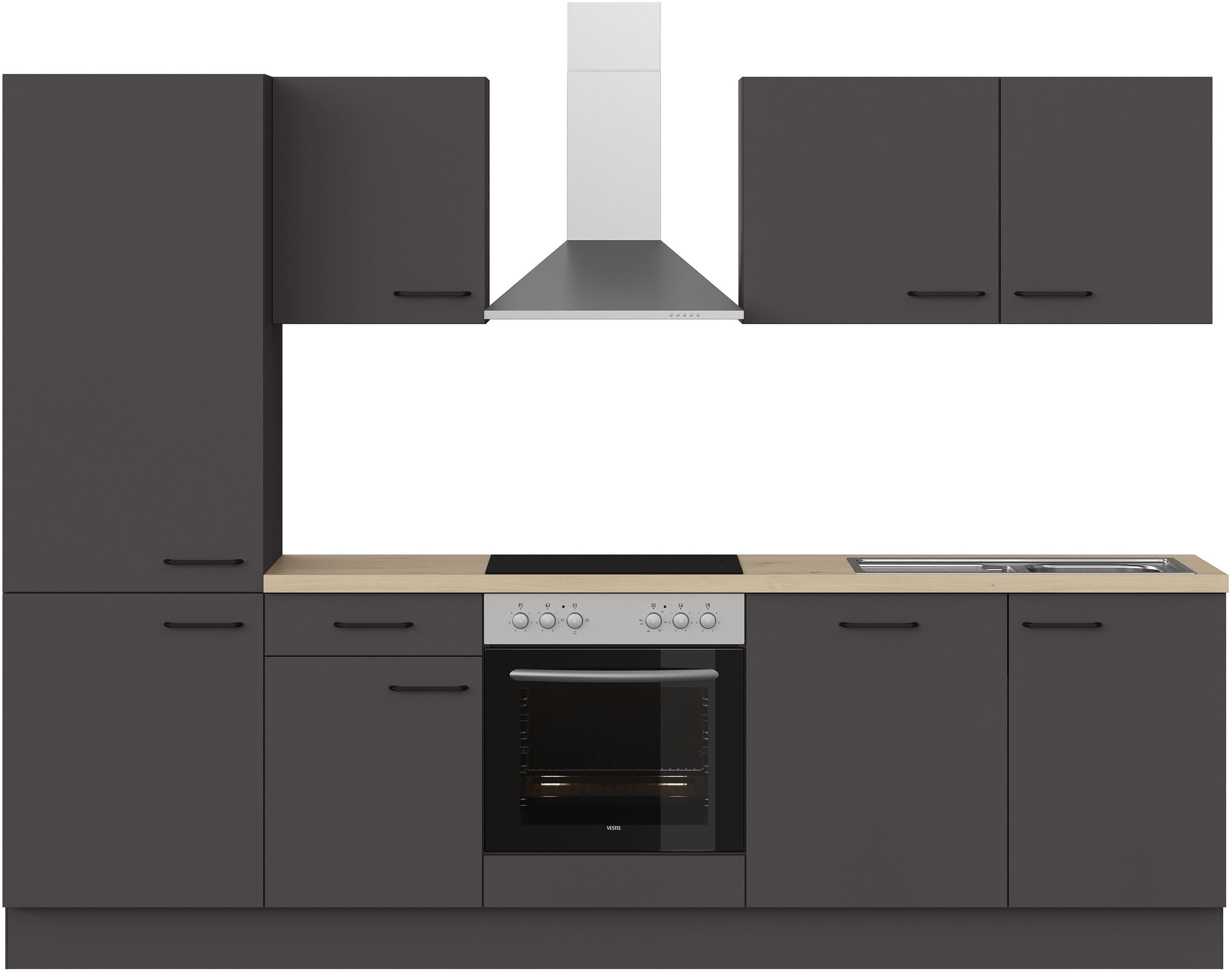 Set beinhaltet | 2x Hängeschrank 50cm Arbeitsplatte b: 220,2cm Frontplatte für vollintegrierten Geschirrspüler 60cm Hängeschrank 60cm Seitenschrank für Kühlgerät 60cm Sockel Spülen-Unterschrank 50cm Unterbau für Einbauherde 60cm Unterschrank mit Schubkasten 50cm |