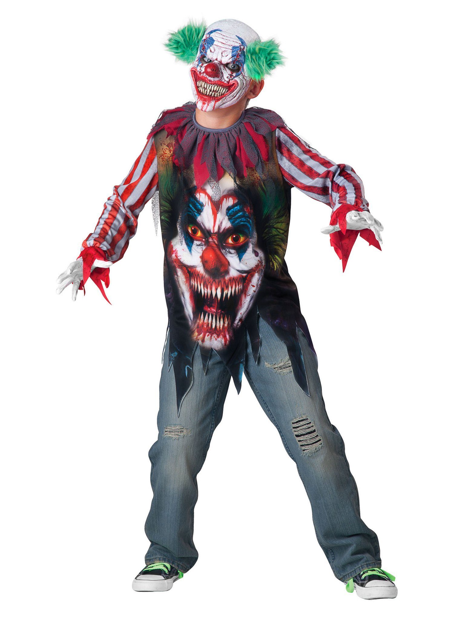 Ausstattung | - Horrorclown Kinderkostüm dreiteilig- mit bedrucktem Oberteil- mit Clownkragen- mit Halbmaske mit Kunsthaar- ohne Hose, Schuhe und Handschuhe |