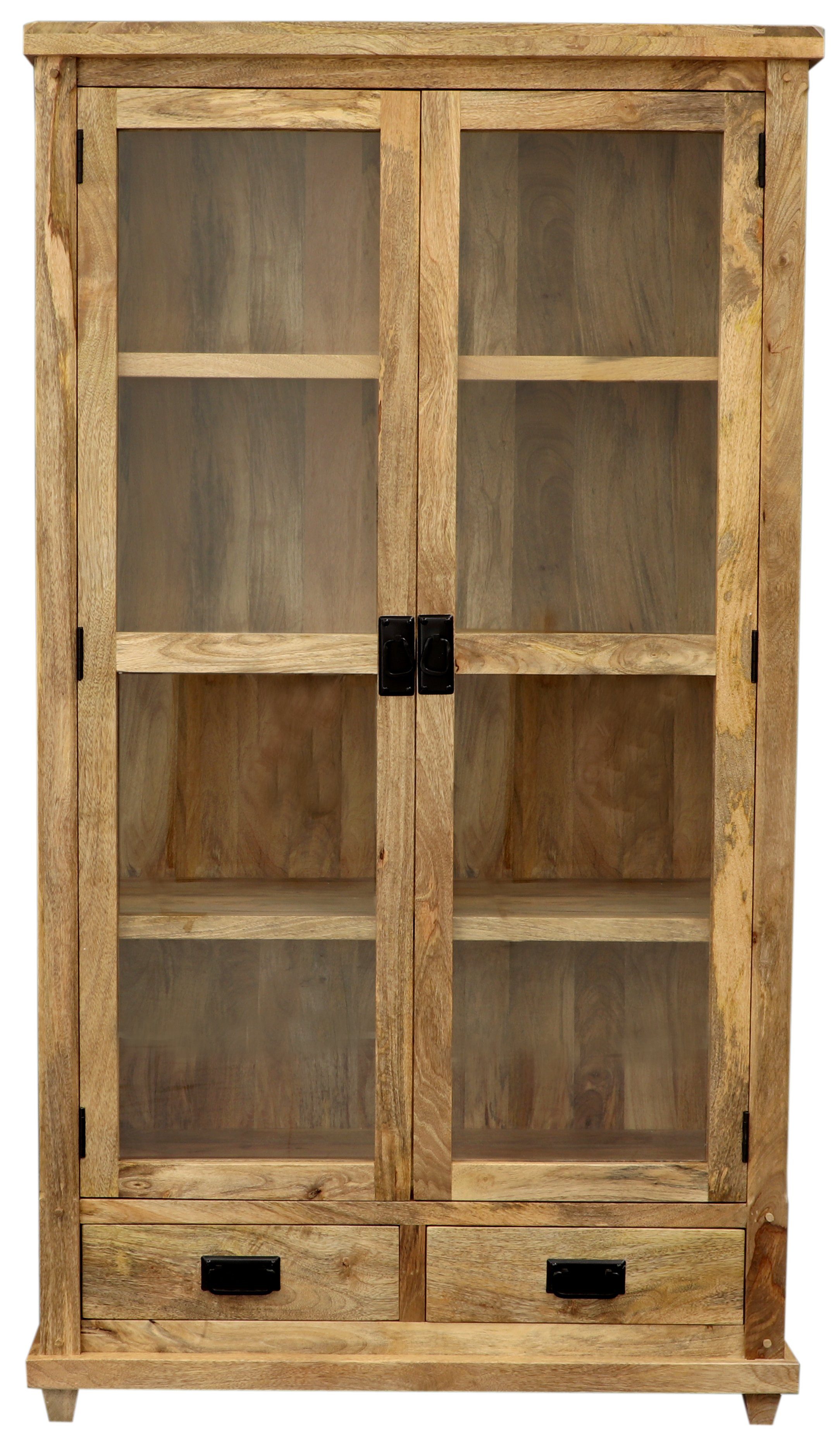 Erleben Sie die zeitlose Eleganz der Vitrine Devi, gefertigt aus hochwertigem Mango-Massivholz. Mit ihren großzügigen Abmessungen von 100 cm Breite, 180 cm Höhe und 45 cm Tiefe ist diese Vitrine nicht nur ein attraktives Möbelstück, sondern auch äußerst funktional. Die verglaste Tür bietet Ihnen die Möglichkeit, Ihre Lieblingsobjekte stilvoll zu präsentieren, während mehrere Regalböden ausreichend Platz für Bücher, Geschirr oder Dekorationselemente bieten. Zusätzlich sorgen zwei Schubladen mit robusten Metallgriffen dafür, dass Sie wertvolle Gegenstände sicher und ordentlich aufbewahren können. Mit einem Gewicht von 78 kg garantiert die Vitrine nicht nur Stabilität, sondern auch Langlebigkeit. Setzen Sie ein stilvolles Statement in Ihrem Zuhause mit der Vitrine Devi.