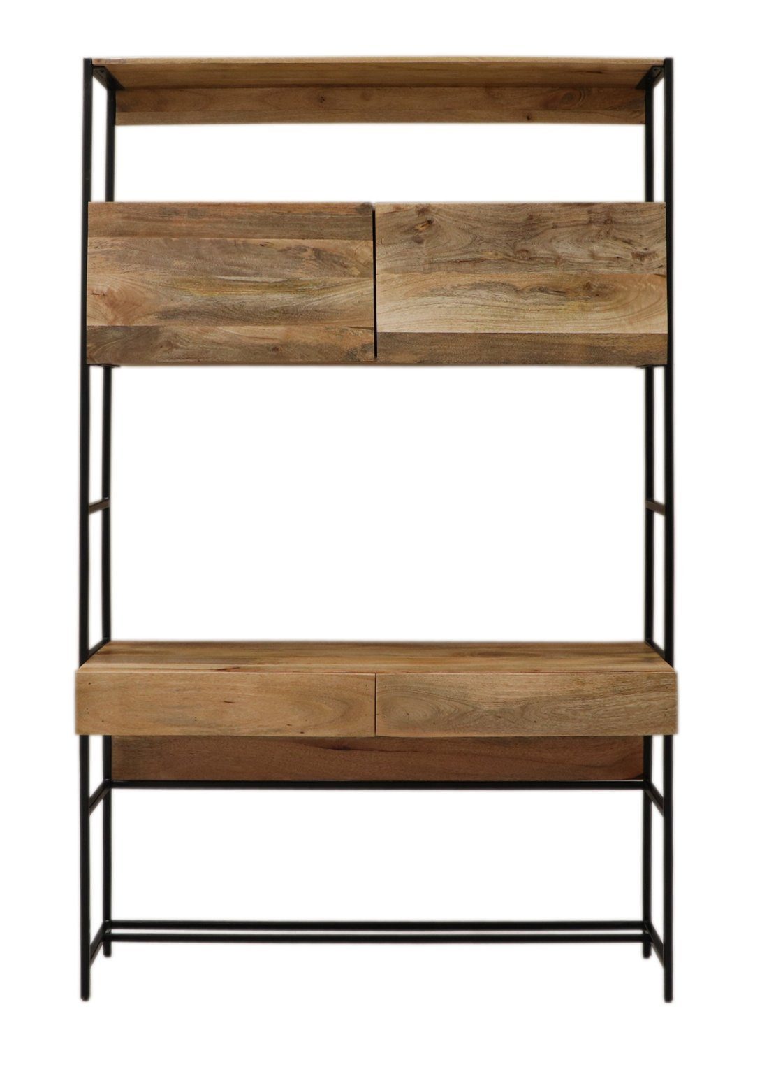 Der Schreibtisch mit Bücherregal hat zwei Türfächer oben und zwei Schubladen, er ist aus hochwertigem Mangoholz und Metall im Industrial Style hergestellt. Sie können sich die Schreibtische mit Bücherregal, die wir auf Lager haben, vor Ort ansehen, oder Sie bestellen auftragsspezifisch. Indische Industrial-Möbel Mango-Massivholz.