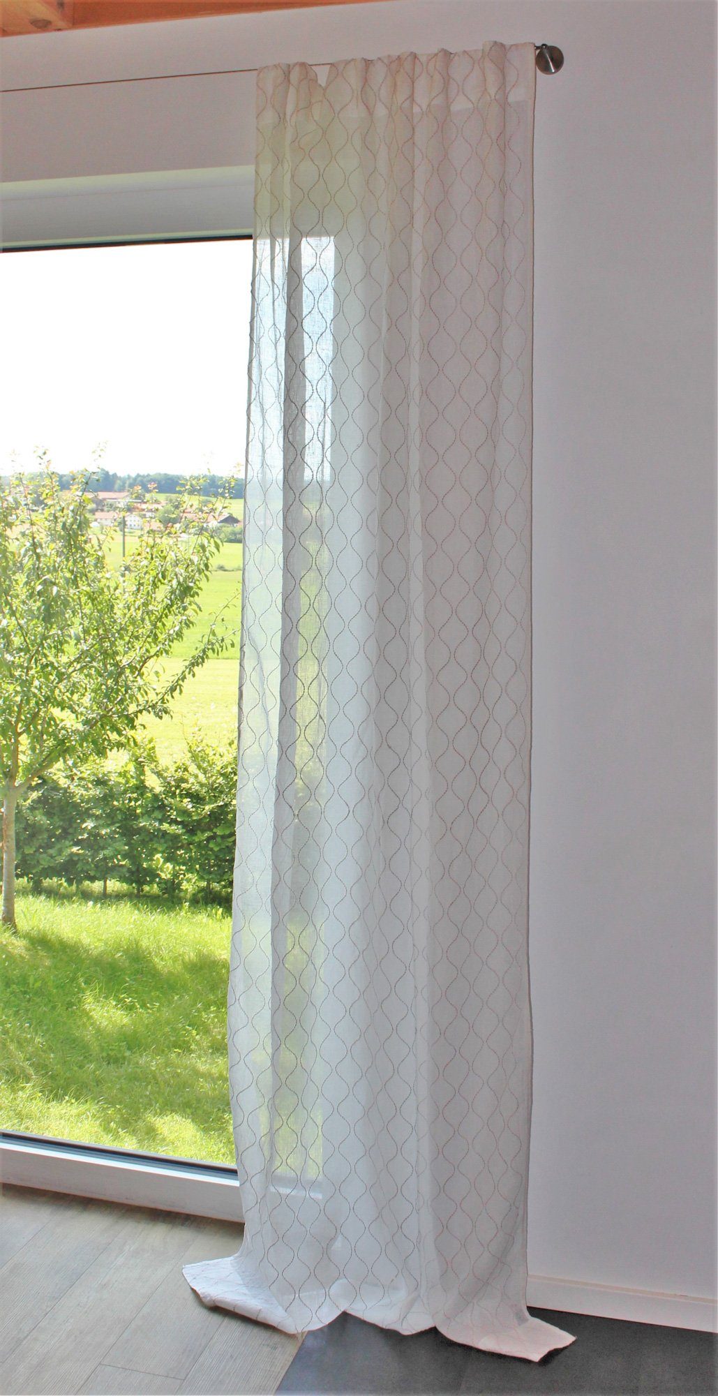 Vorhang aus creme farbener Leinengaze, 100% Leinen natur mit braunem Wellenmuster bestickt