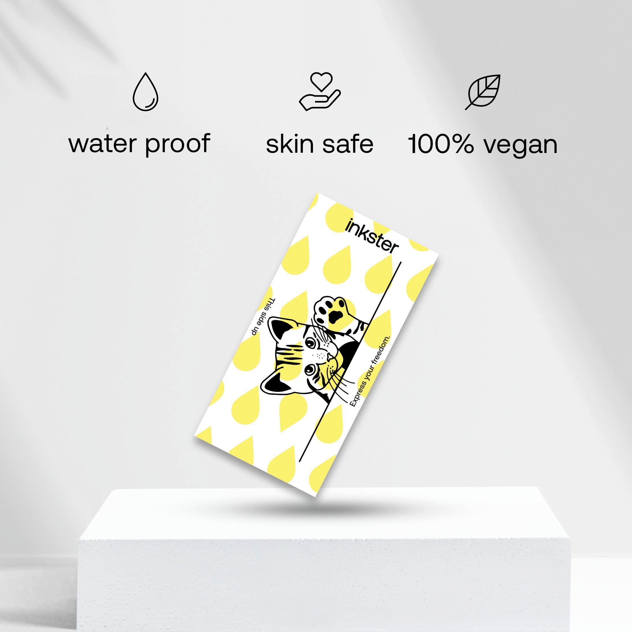 Die neuen revolutionären Inkster-Tattoos lassen sich wie Sticker auftragen, ziehen aber in die erste Hautschicht ein. Das Auftragen des Inkster-Tattoos ist in 1-2 Minuten erledigt. Da dein Inkster-Tattoo in die erste Hautschicht einzieht, kann Wasser deinem Tattoo nichts anhaben. Um deine Haut zu schützen, basiert unsere Tinte auf pflanzlicher Basis mit natürlichen Inhaltsstoffen. Dein Inkster-Tattoo ist, abhängig von der Position am Körper, 10-14 Tage sichtbar.