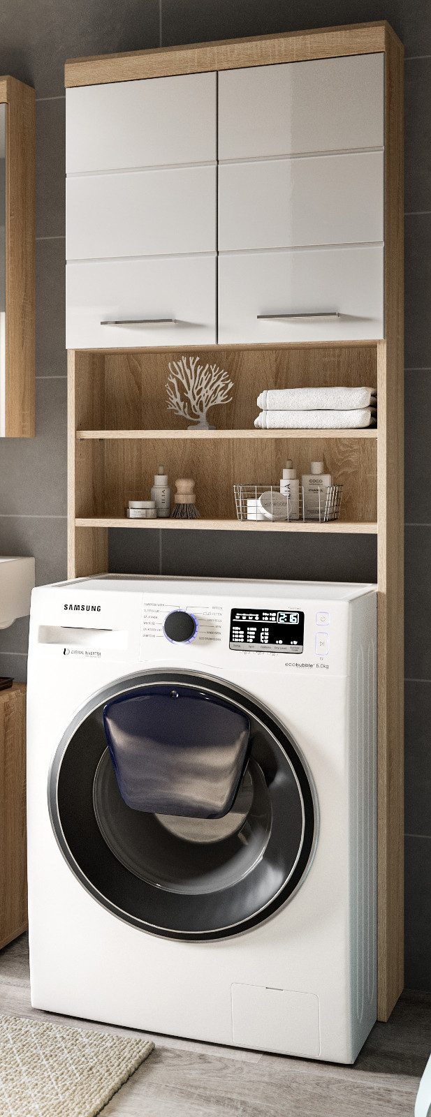 Der Waschmaschinenschrank "Mambo" bietet Ihnen eine perfekte Lösung für ein aufgeräumtes Badezimmer. Mit seiner weißen Hochglanzfront und dem Dekor Sonoma Eiche hell fügt er sich harmonisch in jedes Badezimmer oder jeden Wirtschaftraum ein und schafft eine angenehme Atmosphäre. Hergestellt aus FSC®-zertifiziertem Holzwerkstoff, garantiert er Langlebigkeit und Эко-товары. Mit den Abmessungen von 63 x 191 x 24 cm passt Ihre Waschmaschine (60 cm) perfekt in das vorgesehene Fach. Nutzen Sie die offenen Fächer darüber für häufig benötigte Waschmittel oder Handtücher und verstauen Sie weniger genutzte Utensilien in den 4 geschlossenen Fächern. So haben Sie alles griffbereit und ordentlich gelagert.