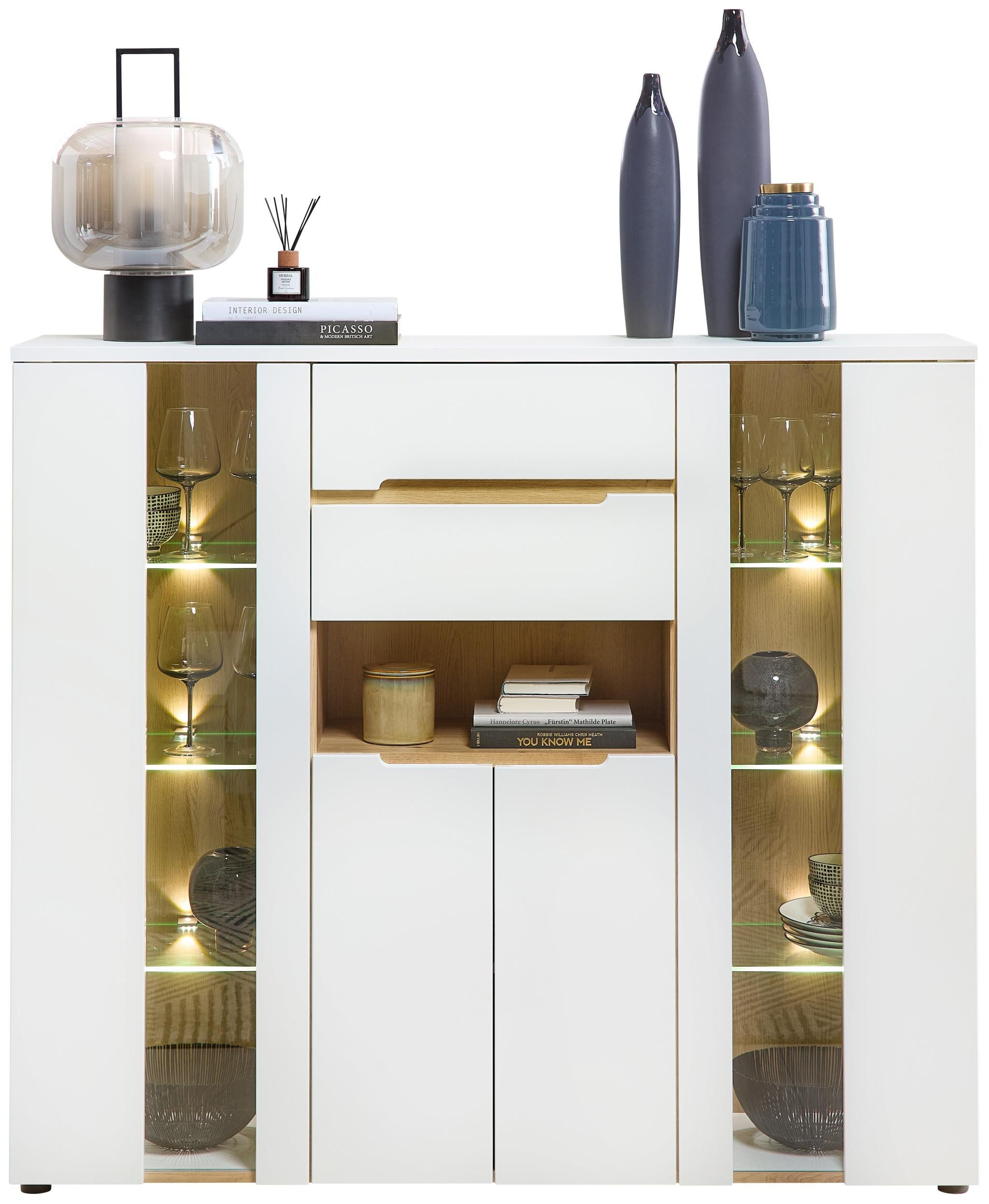 Die ansprechende Kombination von weiß und Artisan Eiche verleiht Ihrem Raum einen modernen und einen zeitgemäßen Look. Das moderne Grifflose Design betont zusätzlich das moderne Erscheinungsbild des Highboards.