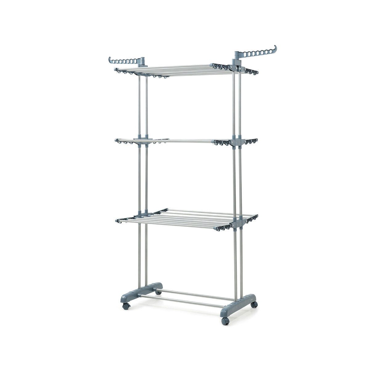 Hängevorrichtungen für Kleiderbügel: Dieser Wäscheständer mit Rädern inkludiert 2 bewegliche obere Hängevorrichtungen zum Aufhängen von Kleiderbügeln mit empfindlicher Wäsche, um Falten und Abdrücke zu vermeiden. Außerdem verfügt er über 3 kleine seitliche Halterungen für Kleiderbügel an der Unterseite jedes seiner 12 Arme. Kleiderbügel nicht inbegriffen.